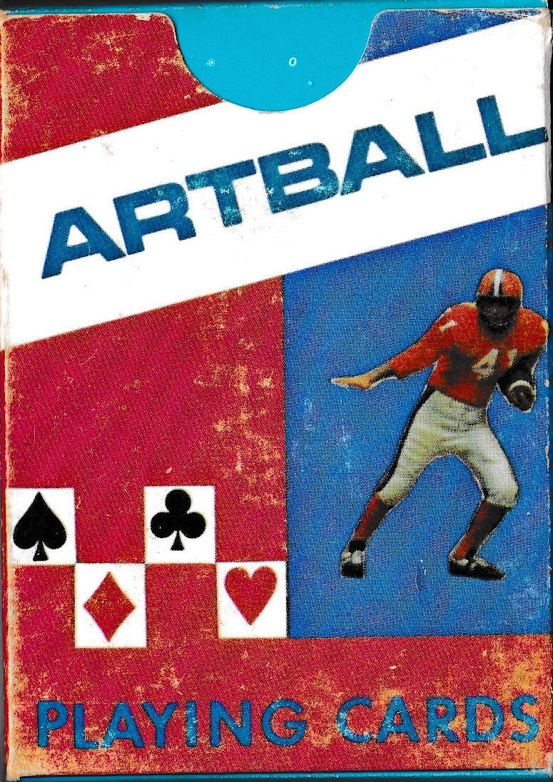 This is a complete pack of 54 playing cards with the head of 1960s art-world celebrities superimposed as a photomontage over football players in action postures and then their name, team and putative positions also pasted over the originals. It was created by Don Celender (1931-2005), an American conceptual artist and professor. See the box►