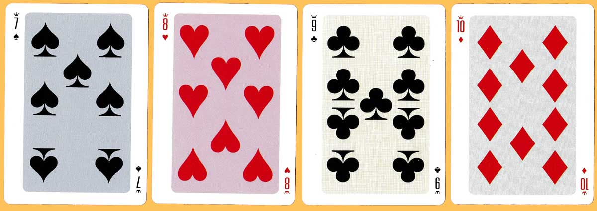 The aces and court cards of this pack, produced by Dark Horse Deluxe in 2004, feature pinup photographs of Bettie Page taken by Bunny Yaeger (1929-2014), herself a model who turned pinup photographer, and who helped to jump-start Page’s career. Each suit has a different pastel colour background: spades – blue; hearts – red; clubs- yellow; diamonds – green. The pip cards are standard and have the same colour background as the courts. Two different jokers complete the pack. See the box►