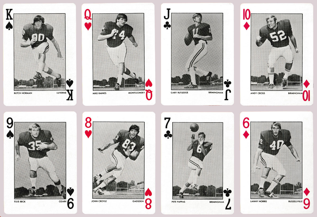 There is a whole page on Wikipedia about the 1972 Alabama Crimson Tide (American) football team and its head coach, Bear Bryant, who appears on the Ace of Spades. The team represented the University of Alabama in the 1972 National Collegiate Athletic Association (NCAA) University Division football season, finishing as Southeastern Conference (SEC) champions. Apart from the Ace of Spades, all the cards have photographs in black and white of named players. Two different sports venues are featured on the Jokers. The team’s logo and name appear on the reverse against a red background. See the box►