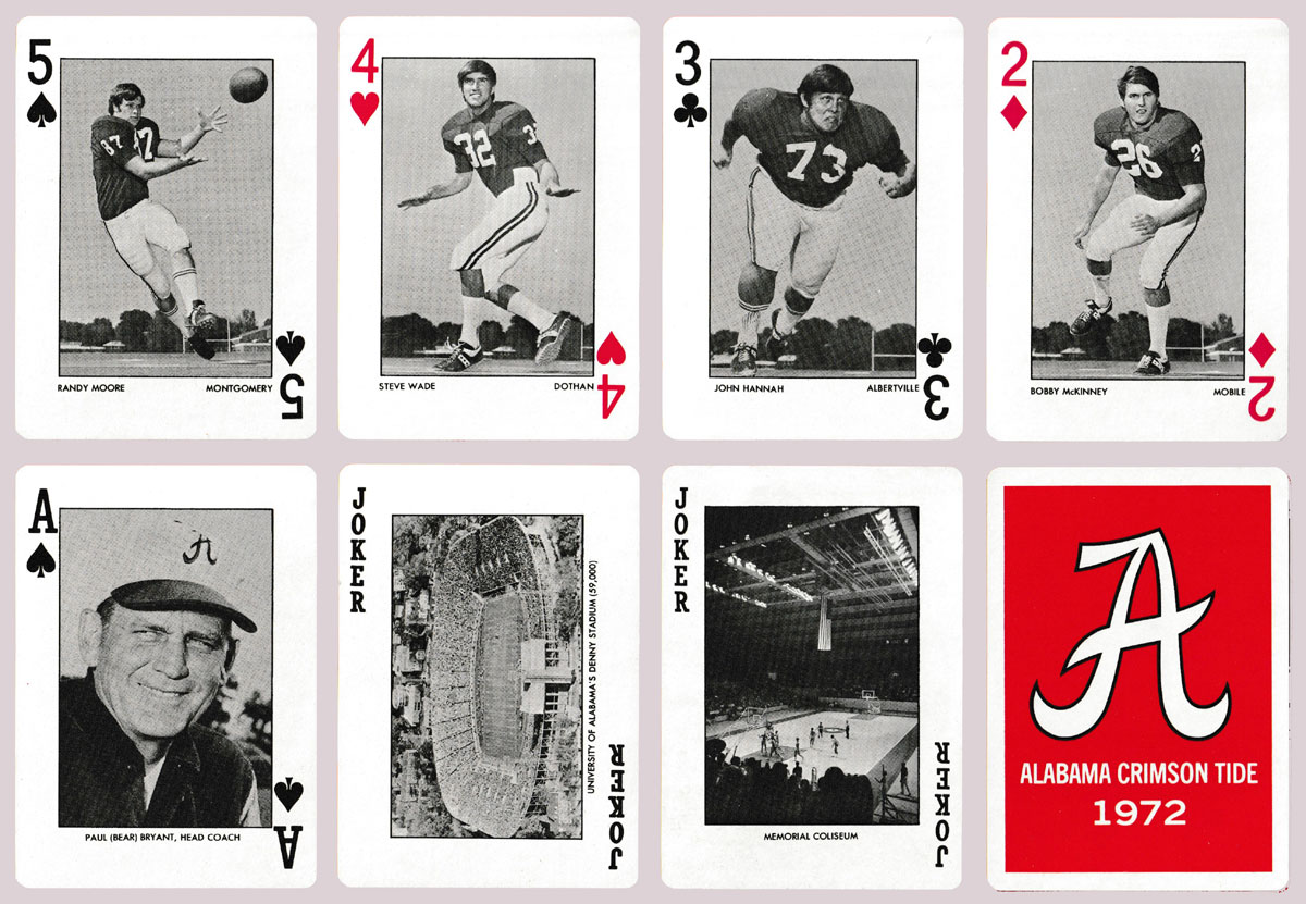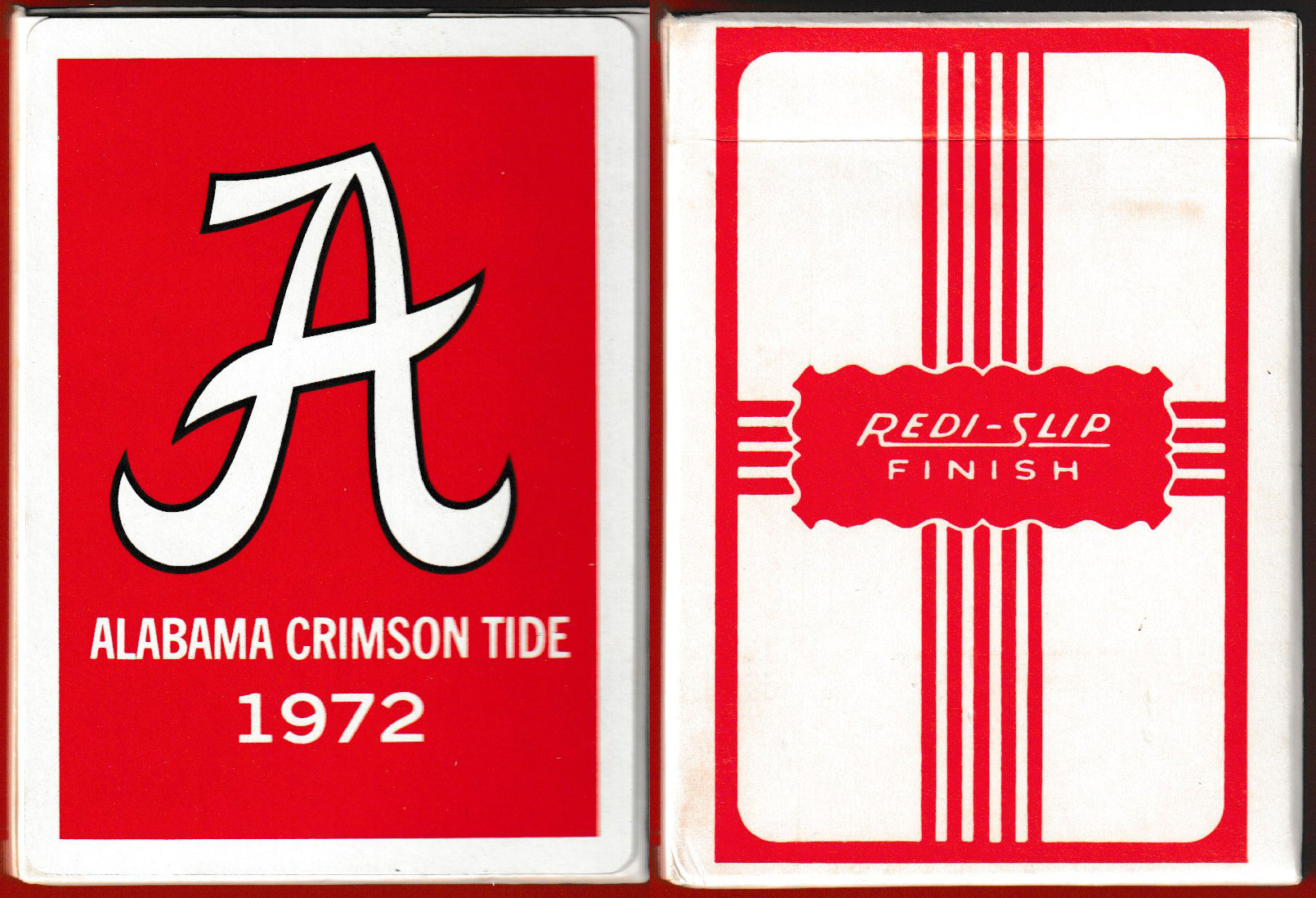 Above: ‘Alabama Crimson Tide 1972’ playing cards made by Brown & Bigelow, USA. 52 cards + 2 Jokers in tuck box. ‘Redi-Slip’® patent plastic coating finish. Size: 63 x 88.5 mm.