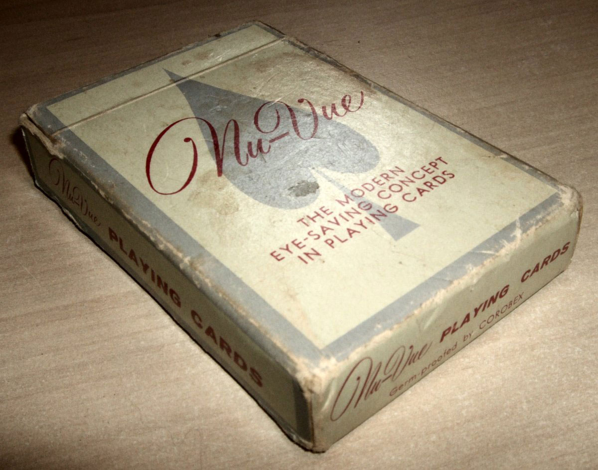 Nu-Vue playing cards by Brown & Bigelow have novel courts and a special tint which are promoted as “the modern eye-saving concept in playing cards”