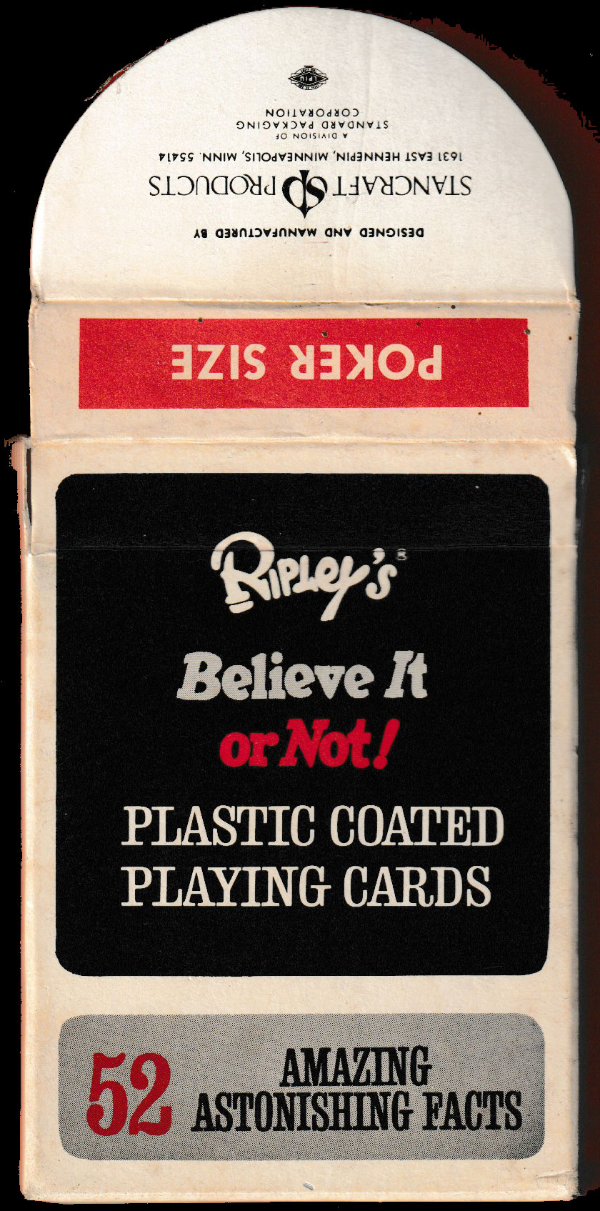 Above: Ripley’s Believe It or Not! playing cards designed and manufactured by Stancraft Products, Minneapolis, MN, USA, c1970. 52 cards + 2 Jokers in tuck box. Size: 63 x 88 mm. The back design is reproduced on the back of the box.