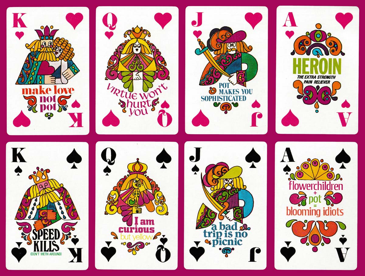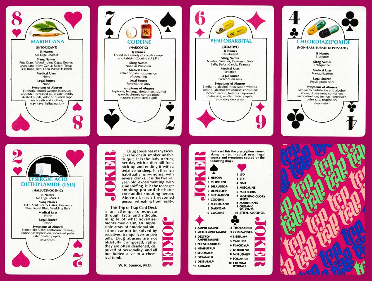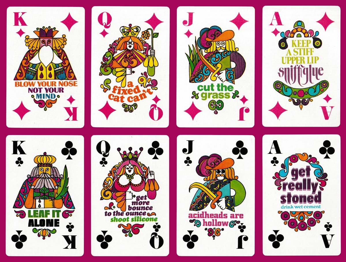 Looking at these cards, they could only have been designed in the flower power era, the age of the hippy. The creator, Dr W.R. Spence, was an anti-drug campaigner who used many methods to promote his messages, including playing cards. The colourful court cards and Aces include jokes or slogans to mock people who use drugs. They certainly have a strong psychedelic feel to them. The pip cards list the prescription names, slang names, medical uses, legal source and symptoms caused by various different drugs. There is a summary of the drug names on one Joker and text about the effects of drugs and the aims of the pack on the other. The colourful, borderless backs repeat the words “trip trap” over and over. The cards are gilt-edged.