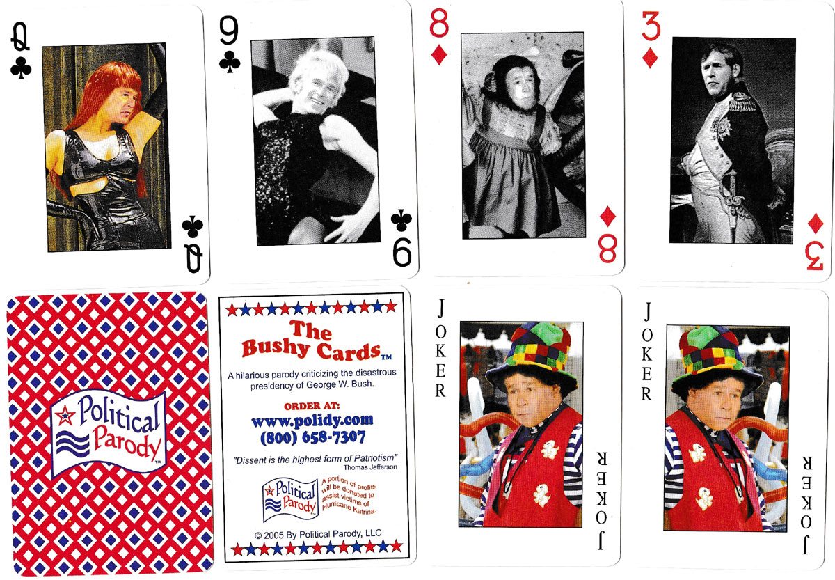 “The Bushy Cards” playing card deck published by Political Parody LLC, USA, 2005.