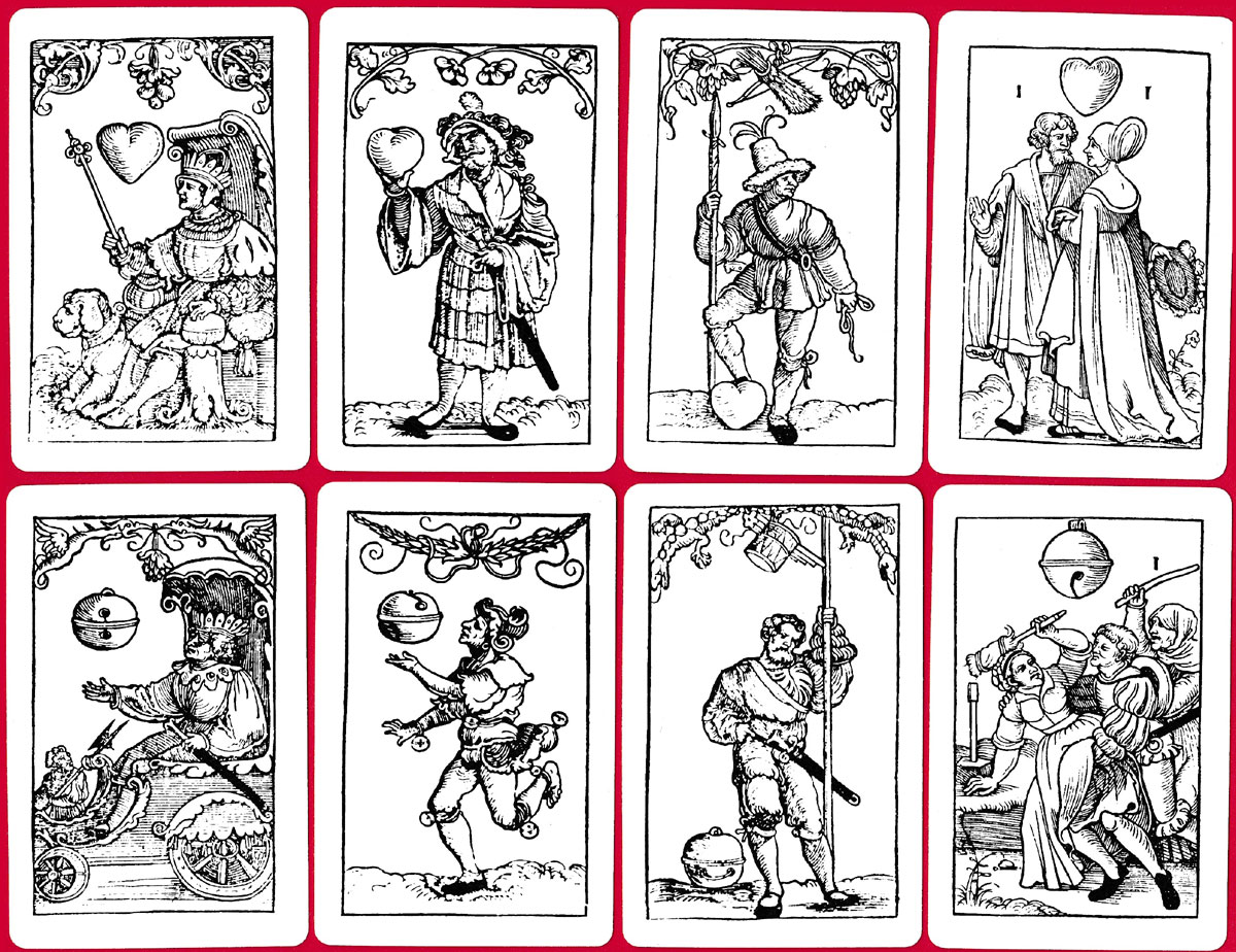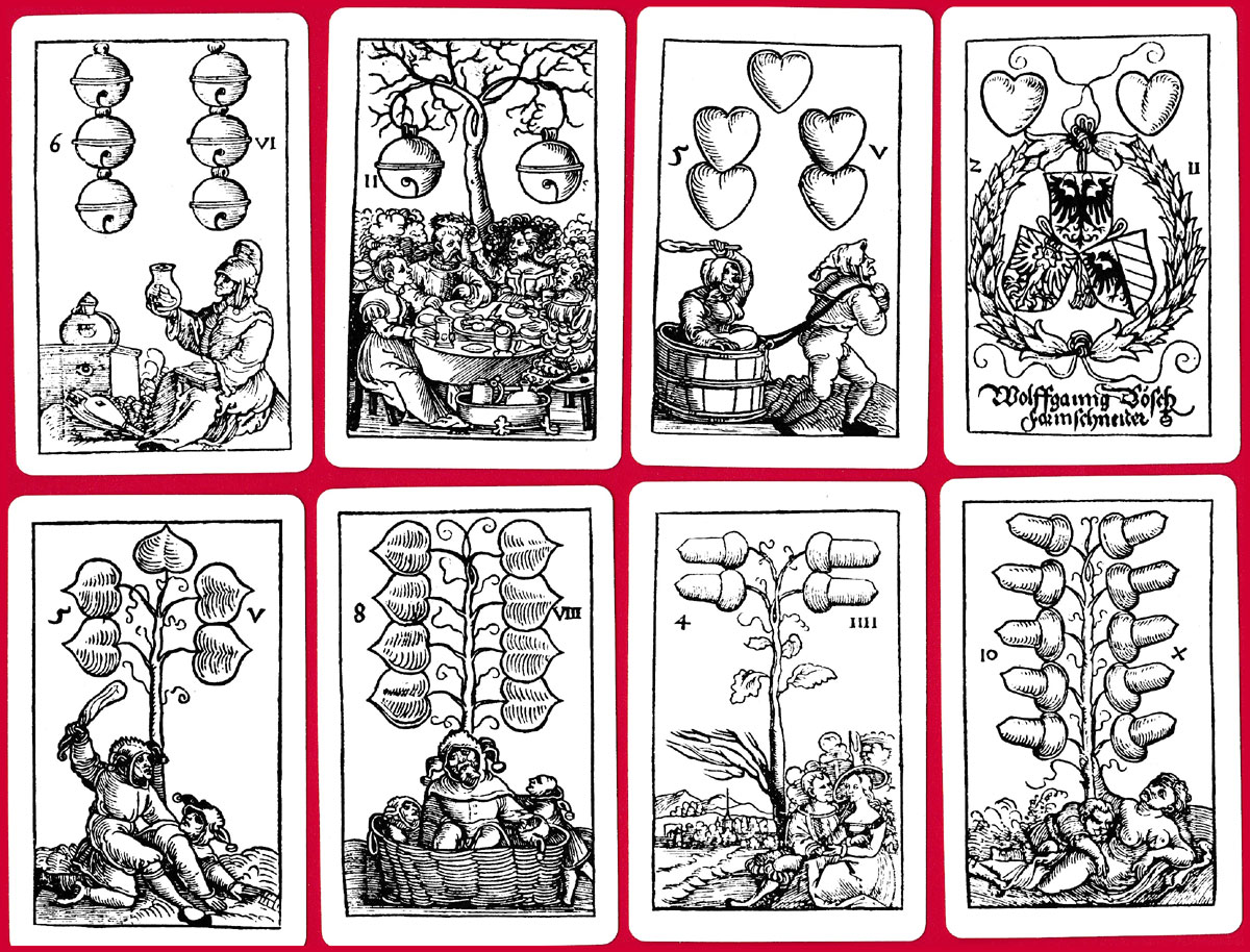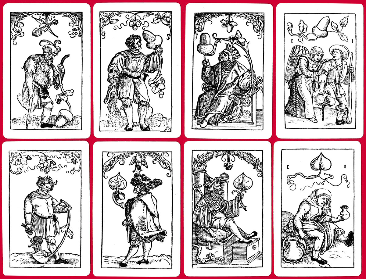 “It comprises a King, Upper and Under Knaves, and 10 through 1, for a total of fifty-two cards with the standard German suits: Acorns, Leafs, Hearts, and Bells. The lower zones of the cards are filled with vignettes all set at the front of the picture plane on a narrow strip of ground. A varied cast from all social classes—in vignettes of humorous folklore, bawdy tales, social parody, and moralizing exempla, occasionally erotic or often scatological—occupies the lower zones. The sources of the images included printed books, single leaf woodcuts, and other graphic works. A master of economy, Schäufelein created spare compositions with a taut line and narrative conciseness that convey the essence of each image with arresting directness”.