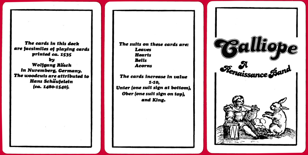 Calliope is a New York City-based band formed in 1975 which plays Renaissance music and modern music using early musical instruments. Perhaps not surprisingly they have selected to produce a facsimile of a pack of cards printed c. 1535 by Wolfgang Rösch in Nuremberg. The woodcuts are attributed to Hans Schäufelein, c. 1480-1540. This pack is uncoloured (though the original was printed from woodblocks and then hand coloured), and the card backs are plain white.