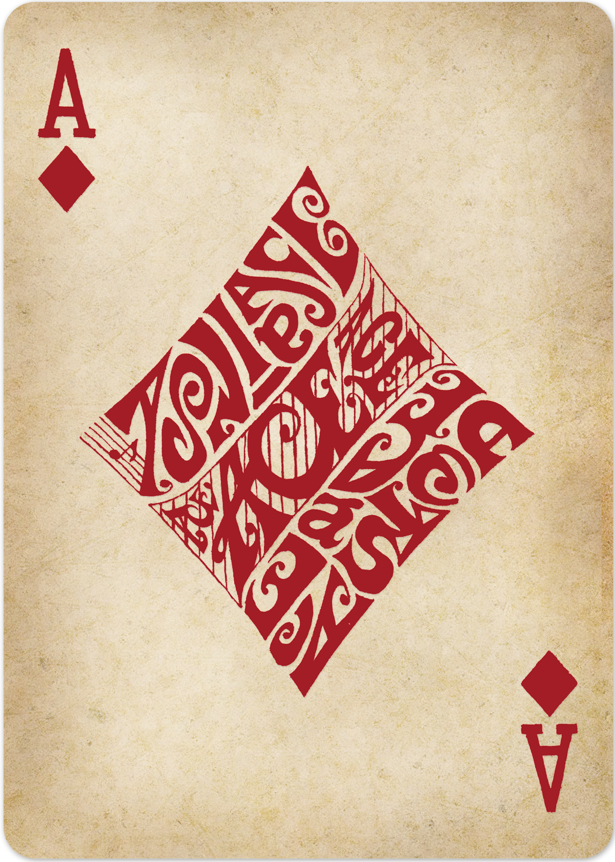 Instead of the usual ace of spades, or a seven of diamonds, this pack has a "spade of aces" and a "diamond of sevens"; meaning that the spade is made up of aces using a typographic and illustrative style.