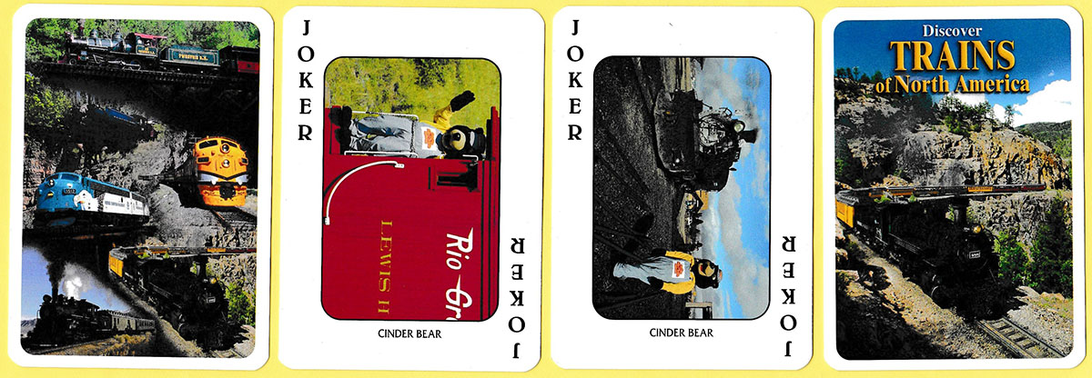 Printed by Cartamundi USA and published by Sea to Sky Photography, these cards feature beautiful illustrations of railways and locomotives from the United States. The majority of trains depicted are steam engines, but both diesel and electric trains are also included. Many of the engines are now located in railroad museums or historic mining and railroad parks. The two jokers are called “Cinder bears”, referring possibly to the Cinder Bear Experience – a half day excursion from Chama to Cumbres Pass, New Mexico→