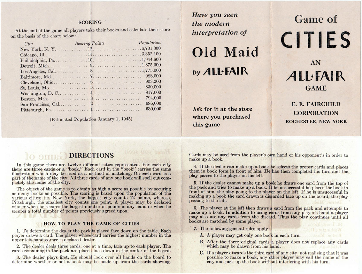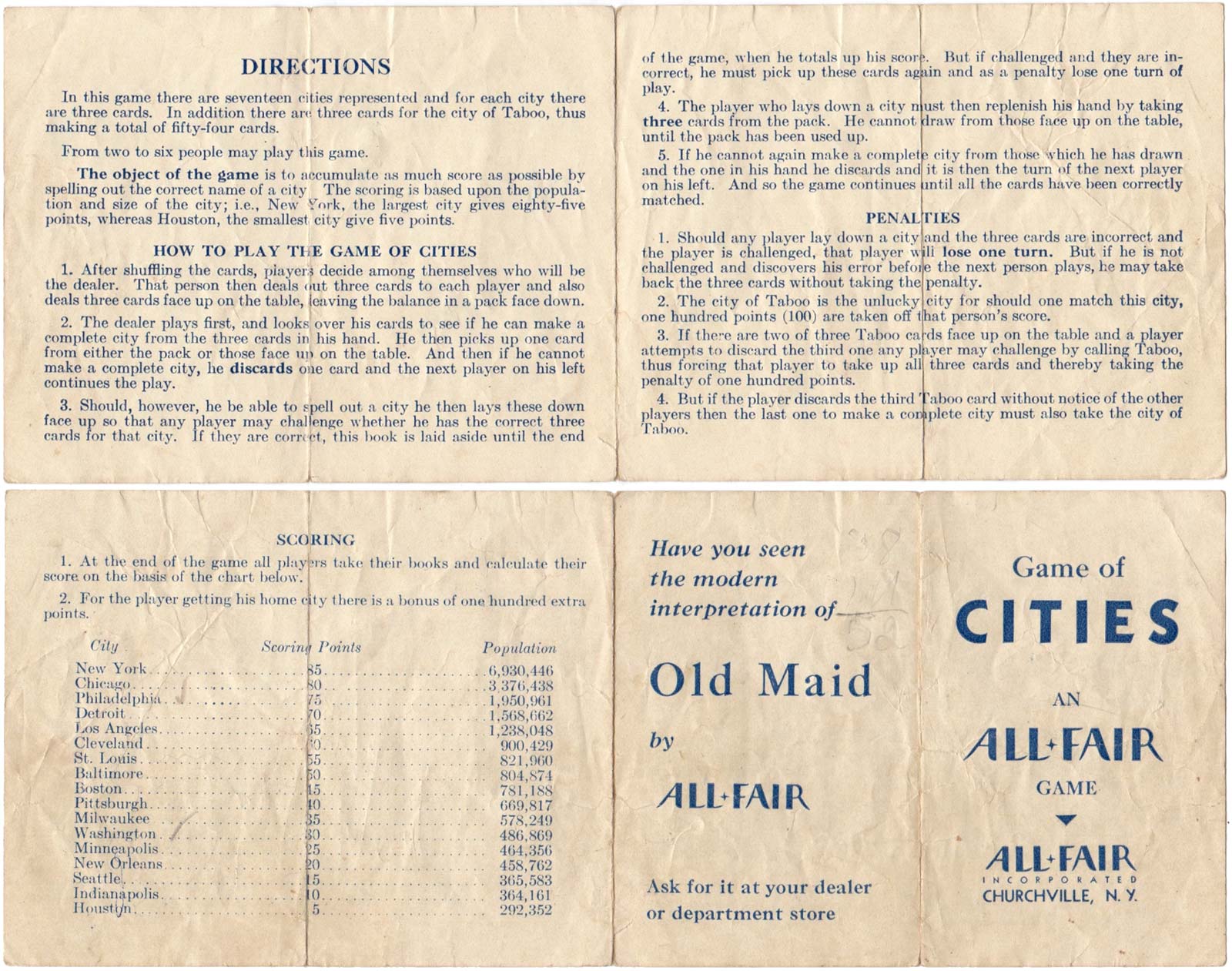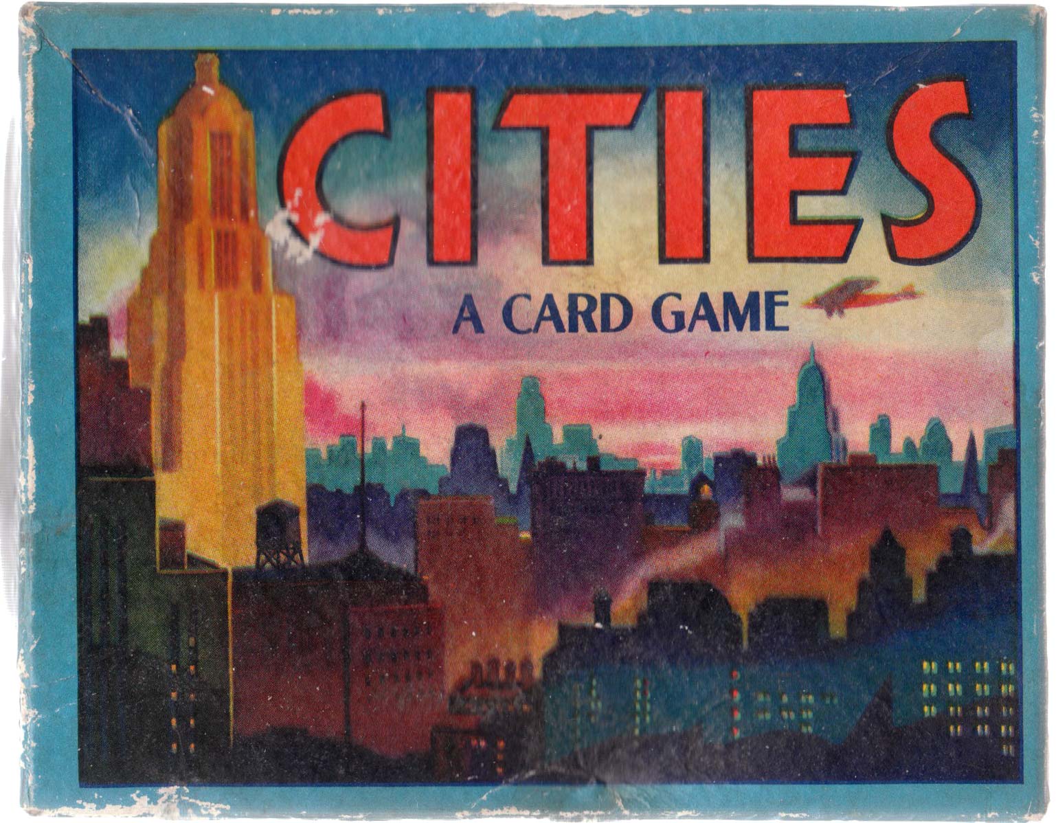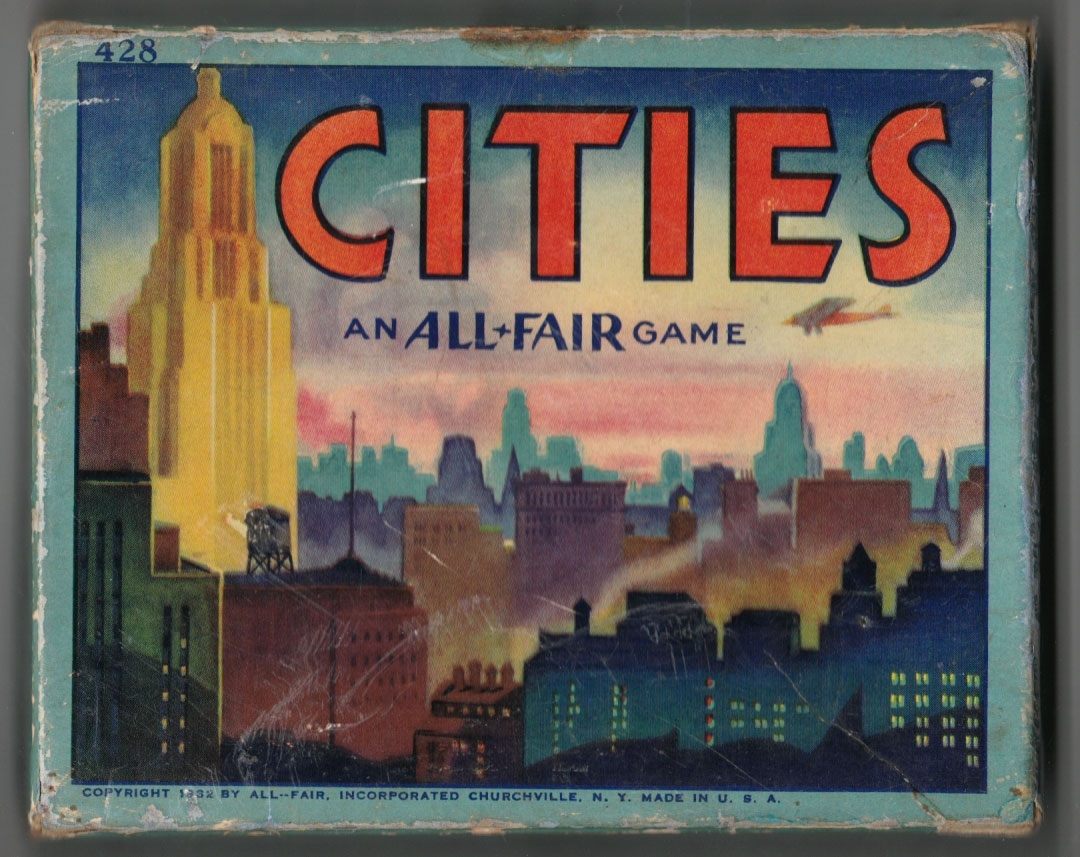 Above: cards from Game of Cities published by E. E. Fairchild Co, 1932. The city of Taboo is fictitious and also a penalty in the game. 54 cards + rules in box.