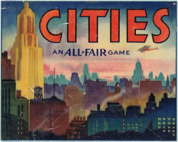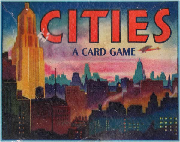 Game of Cities card game was published by E. E. Fairchild Corporation, NY, under their ‘All-Fair’ brand name, in 1932. Seventeen North American cities are represented in sets of three cards each, with the addition of a fictitious city called Taboo, making a total of 54 cards with brief histories of each city printed beneath the images. See the Rules►