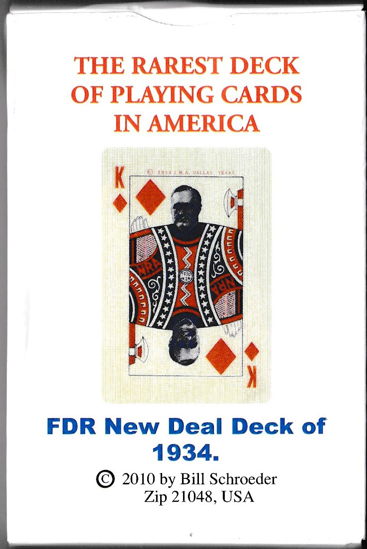 According to publisher Bill Schroeder, this pack was produced in 1934 by J.M.A. Inc. of Dallas, Texas without the agreement of the White House. Roosevelt was so angered that all the packs were subsequently suppressed and destroyed. Some 65 years later, in 1999, one pack was found hidden among the possessions of a former employee of the printing company. The frightened employee gave it to scholar and collector Bill Schroeder and he published this in a limited edition in 2010. See the box►