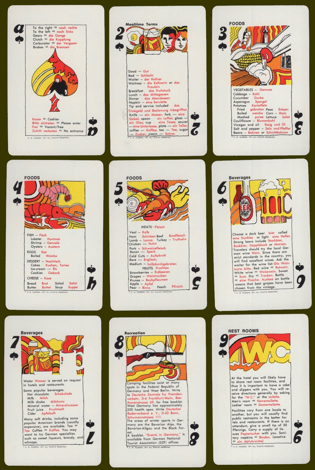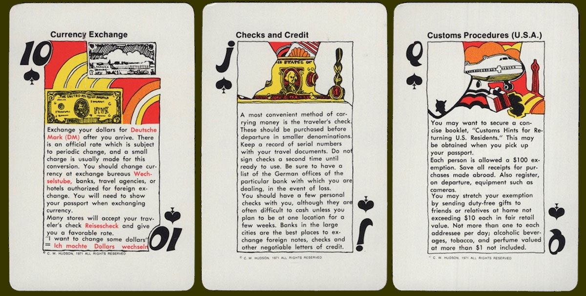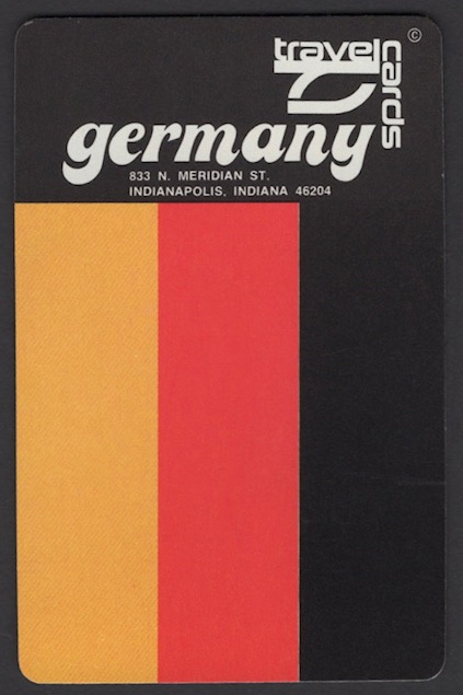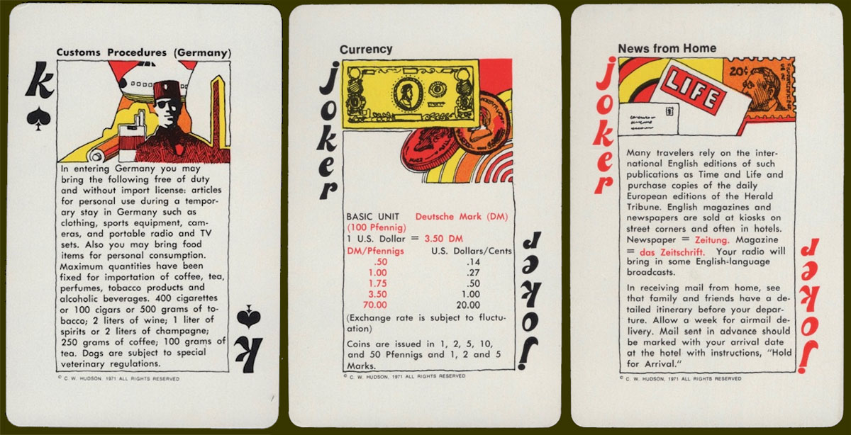 Above: German Travel Cards published by C.W. Hudson, 833 N. Meridian St., Indianapolis, Indiana 46204. 52 bridge sized cards + 2 jokers, 1971.