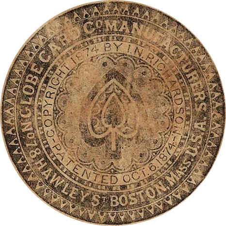 In 1874 I. N. Richardson patented a deck of round, or circular, playing cards which was produced at 68 Cornhill Street, Boston, Mass. In c. 1875 the firm was taken over by I. W. Richardson, the son of I. N. Richardson. The Son’s name replaced that of the father on the Ace of Spades. In c.1878 the firm’s name was changed to Globe Card Co. which name was used on the Ace of Spades, replacing that of the son, I. W. Richardson. In c.1880 the firm moved to larger premises at 78 Hawley Street, Boston, Mass and continued to produce the same deck, changing the address on the Ace of Spades accordingly. All the Aces of Spades carried the patent date of Oct. 6, 1874 by I. N. Richardson►