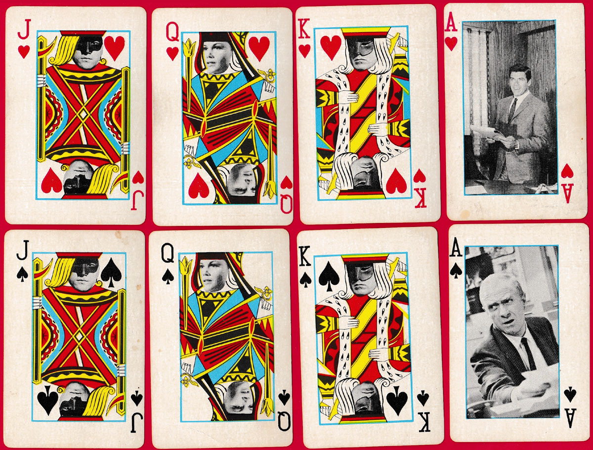 This pack of 'The Green Hornet' playing cards from US manufacturer Ed-U-Cards, dates from 1966 and comprises 52 cards plus 2 jokers, with the aces and pip cards featuring a black and white still shot from the original series. The court cards are specially altered with the faces of the actors replacing those of the courts. Unfortunately, the same faces are repeated in each suit.