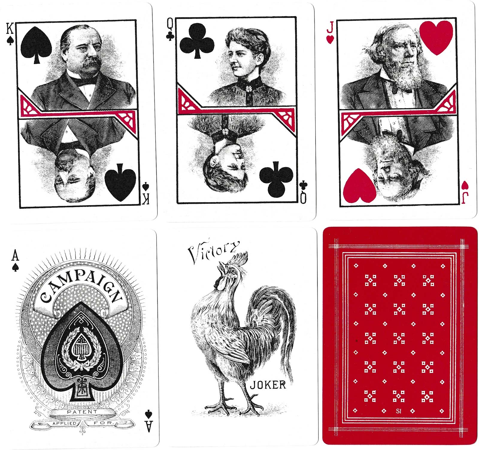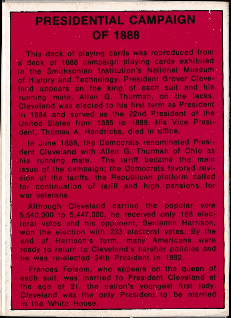 This is a reproduction of a pack originally issued in 1888 in support of Grover Cleveland who was already serving as the 22nd President of the United States (1885-1889), and was part of his campaign to be re-elected. Although he was unsuccessful, he did return to office in 1892 as the 24th President (1893-1897). The reproduction was produced by U.S. Games Systems Inc., New York in 1980. (There is some speculation that this pack was not originally produced for Cleveland's 1888 campaign but rather for his later campaign in 1892).