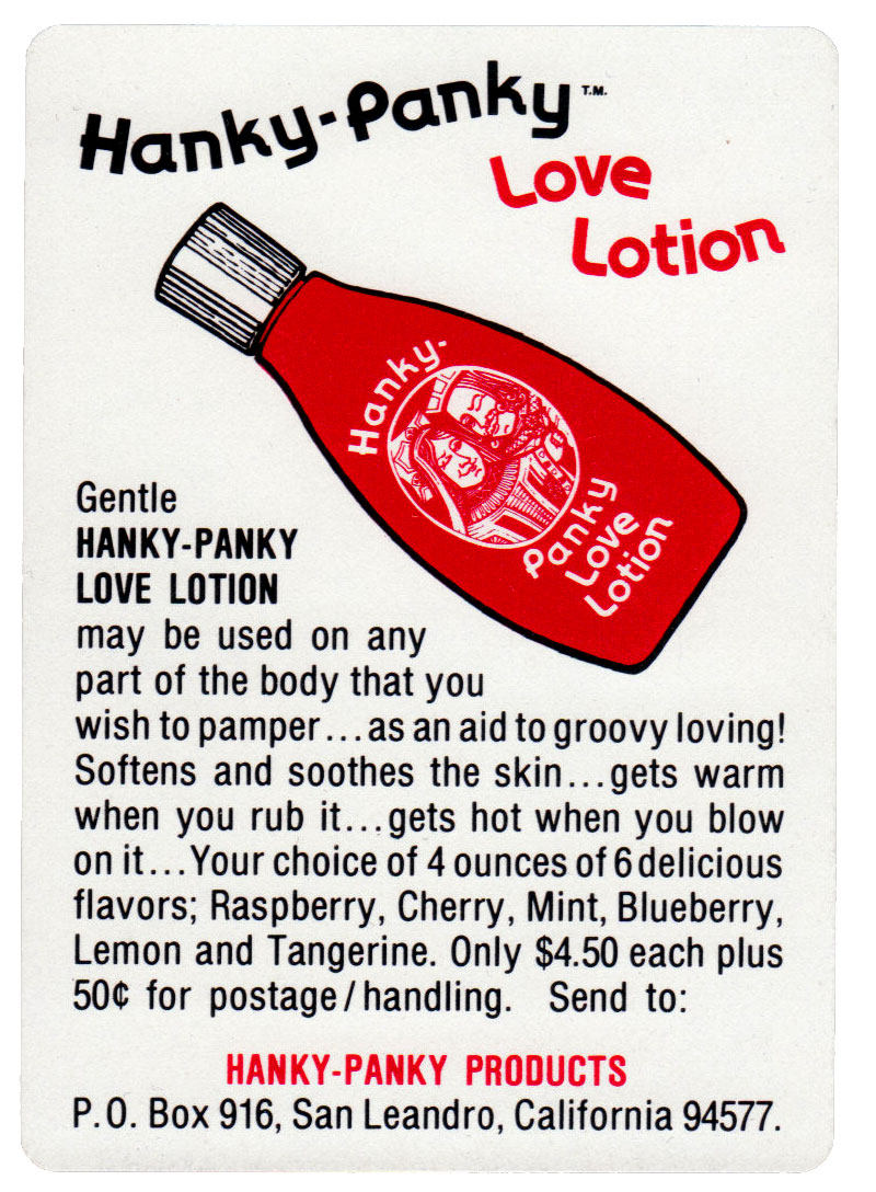 The game includes details of how to purchase Hanky-Panky Love Lotion, which comes in 6 flavours.