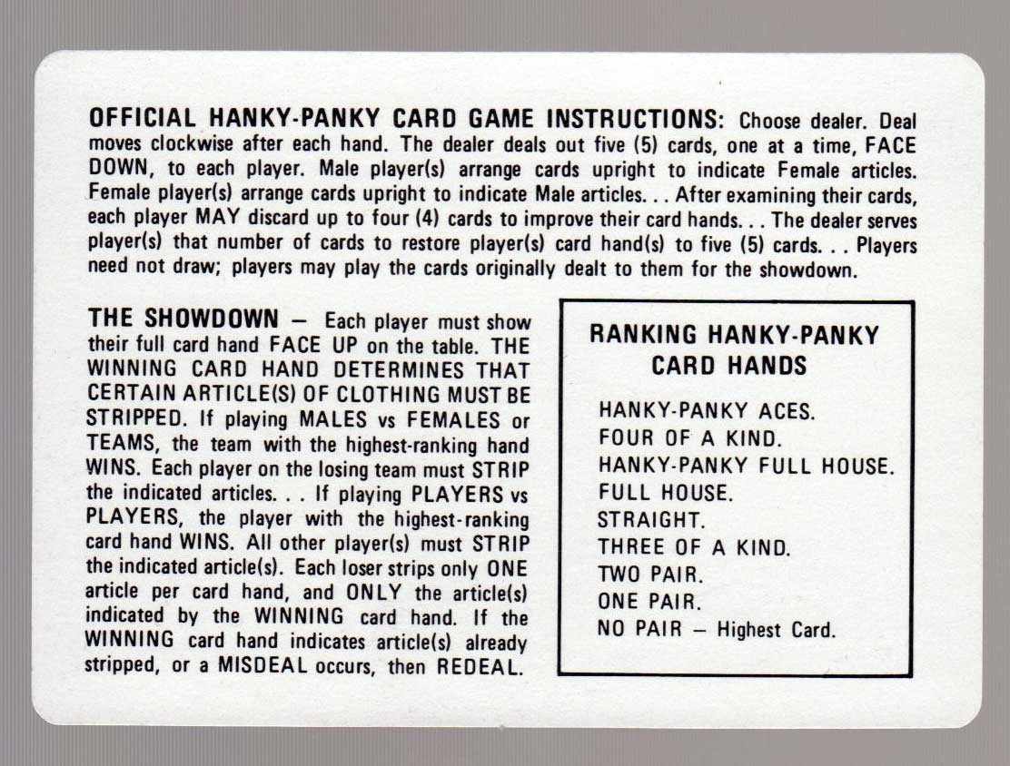 Hanky-Panky is a card game based around the idea of strip poker. Cards show male and female items of clothing and are ranked like normal playing cards, with shoes and stockings ranking lowest, up to shirts and underwear ranking highest. After players examine their cards and discard unwanted cards, then comes the showdown. See the Rules►