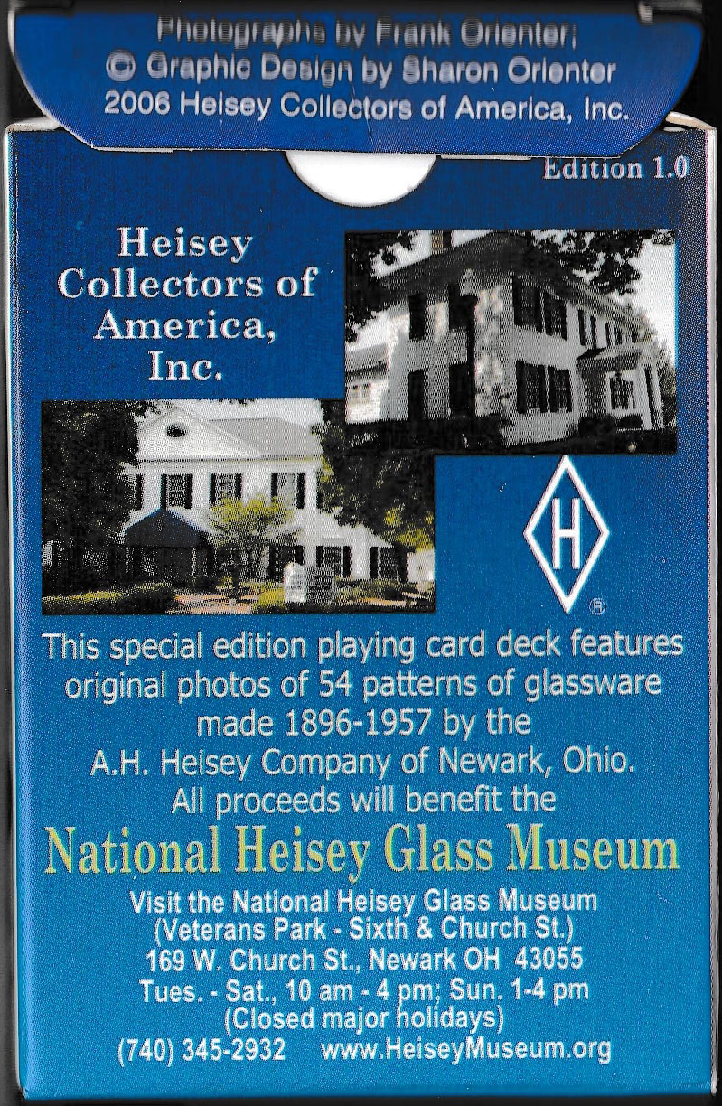 The National Heisey Glass Museum (NHGM) was established in Veterans Park in downtown Newark, Ohio in 1972 to display and promote the study of the products of the A.H. Heisey & Company (1896-1957). The company produced high-quality, handmade glass tableware and fine and decorative glass figurines which have become highly collectible. The Museum was established and is maintained by the Heisey Collectors of America, Inc. Each of the 54 cards shows a photograph (taken by Frank Orienter) of a glass product or products, with name and Museum number. The graphic designer was Sharon Orienter. See the box►