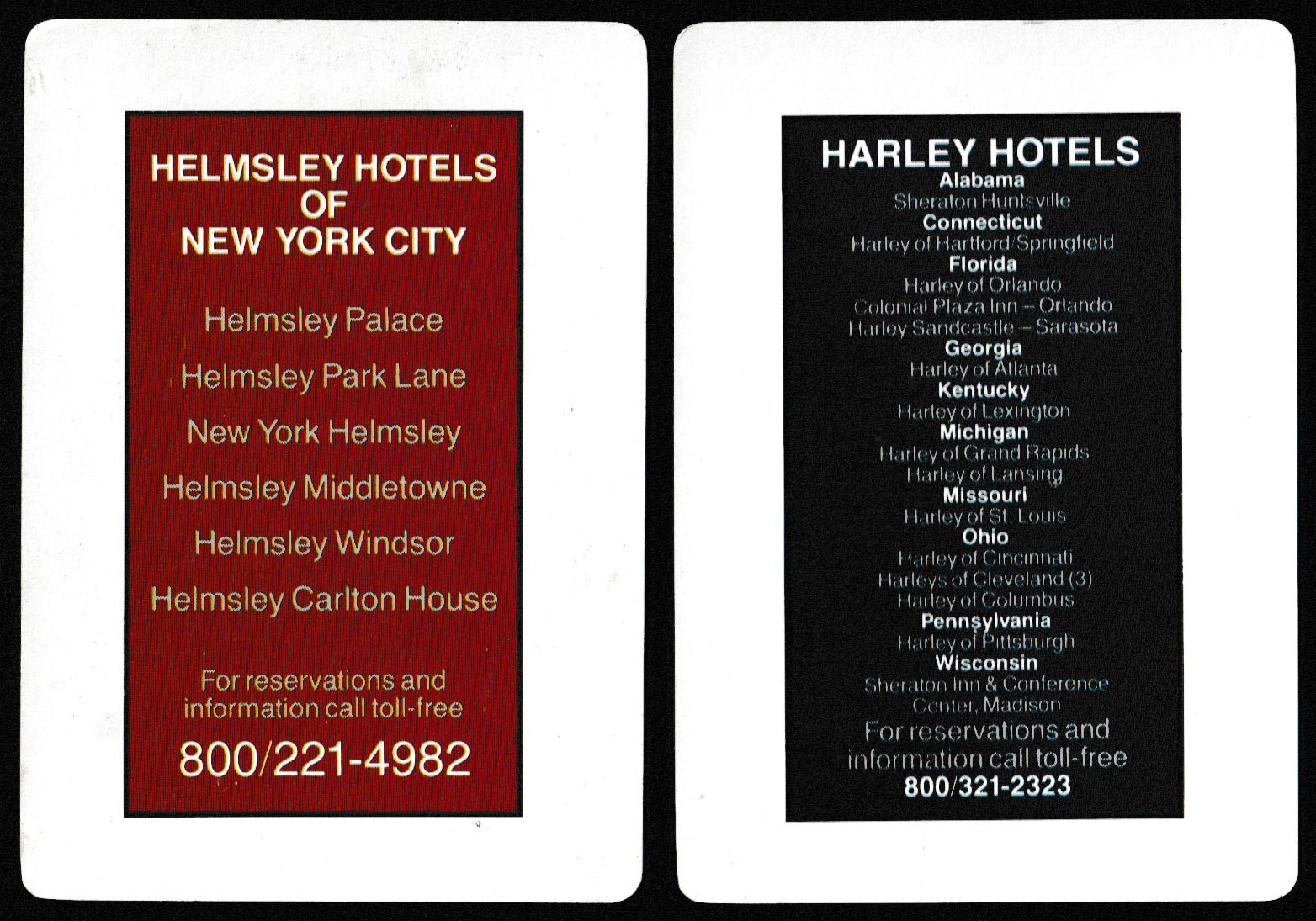 Above: publicity pack for the Harley and Helmsley Hotels, U.S.A., c.1986. 52 cards + 4 extra cards in tuck box. Size: 63 x 89 mm. Maker unknown.