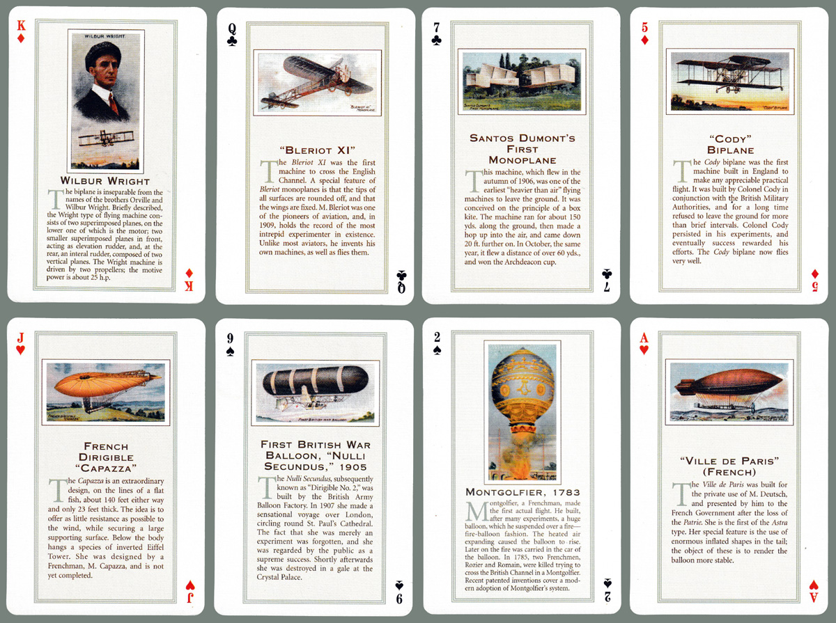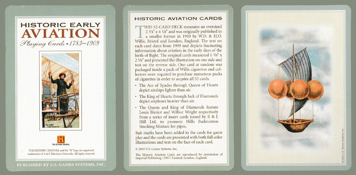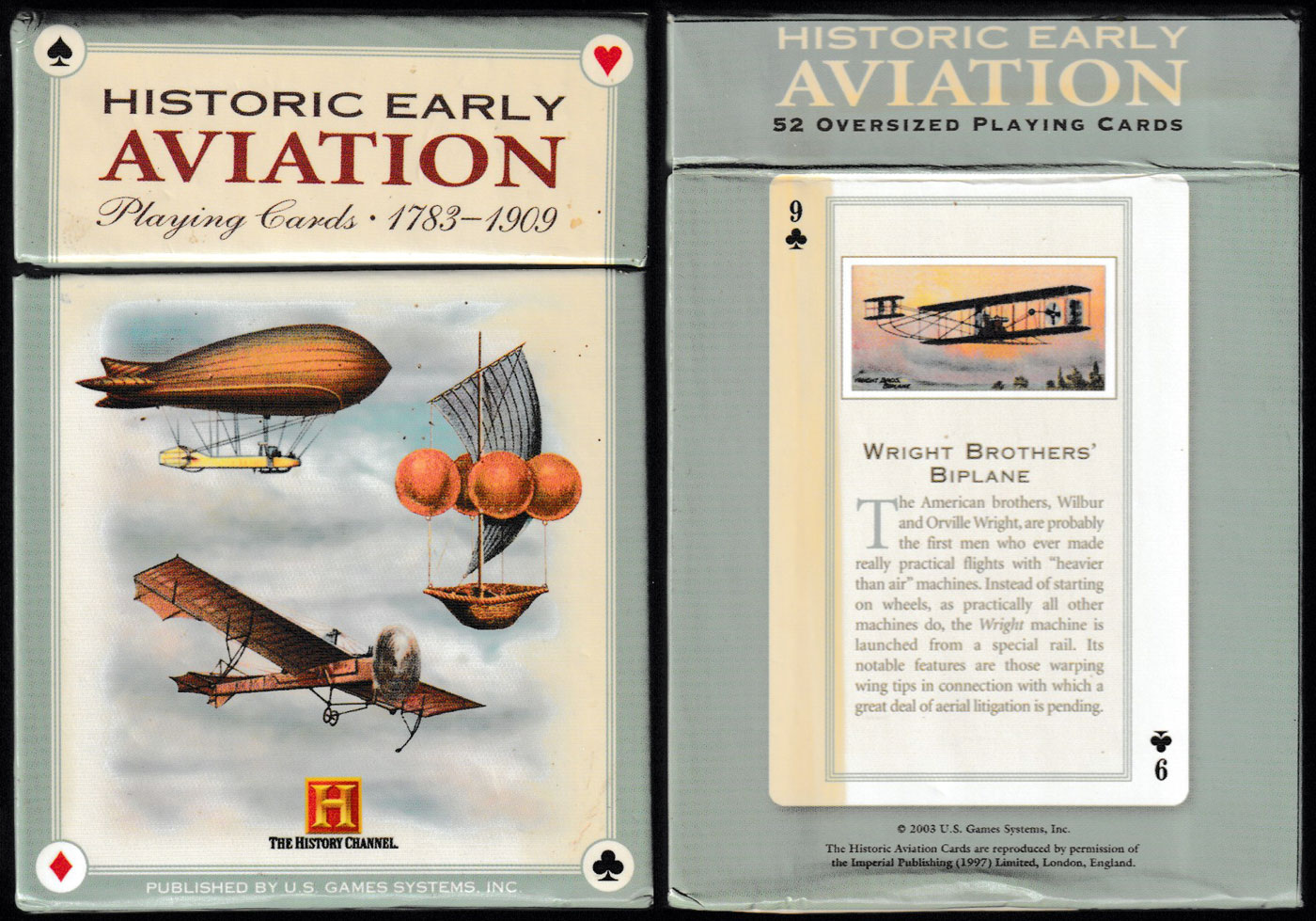 Above: Historic Early Aviation playing cards published by U.S. Games Systems, Inc., Stamford, CT, USA, 2003. Printed in China. 52 cards + 2 extra cards in hard, flip-top box. Size: 70 x 105 mm. © 2003 U.S. Games Systems, Inc.