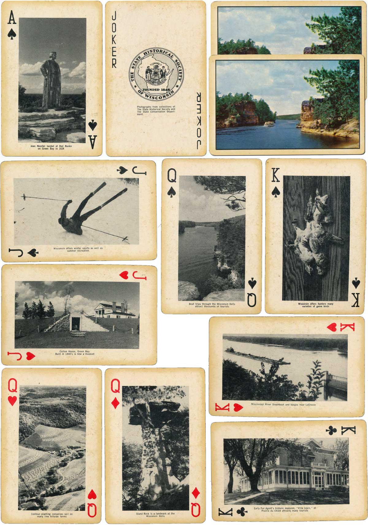 Souvenir deck from the State Historical Society of Wisconsin containing photographs from the collections of The State Historical Society and The State Conservation Department on each card. The photographs are rectangular monochrome b/w images of Wisconsin with descriptive captions beneath each photo. The Joker carries an outline map of the State of Wisconsin with the State Seal superimposed and with the legend ‘Founded 1846’ beneath. The deck could possibly be a centenary issue. The reverse has a colour photo of the Dells of the Wisconsin River showing the Cambrian sandstone rock formations.