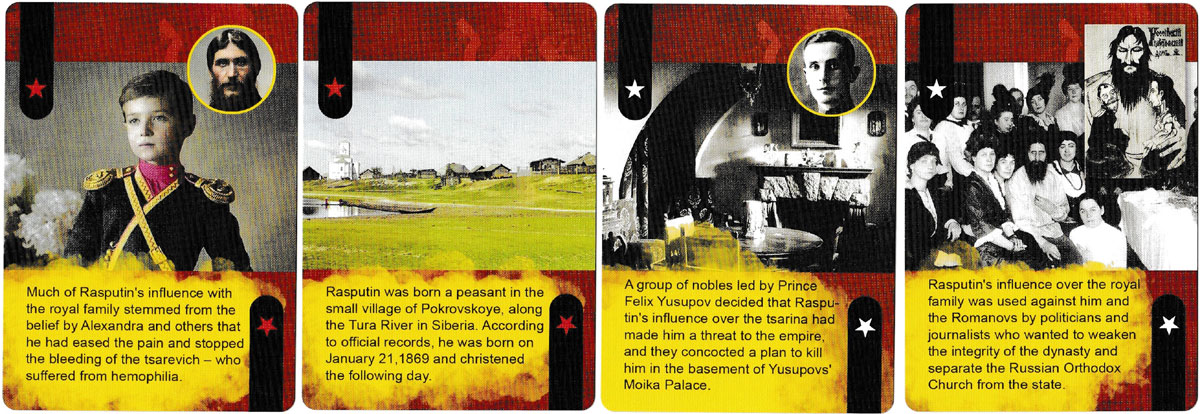 Produced by the Barclay Mountain Co. (Pennsylvania), this pack of 52 cards and 4 jokers offers a wealth of information and photographs on the history of the Russian Revolution. According to the company’s website “Some people tell their stories through books, artwork and movies. We tell our stories using playing cards and tarot cards” – and indeed the information (leading up to and after the 1917 revolutions) is detailed, wide-ranging and historically accurate. The jokers present the story of Rasputin and his influence over the royal family of Tsar Nicholas II. See the box►