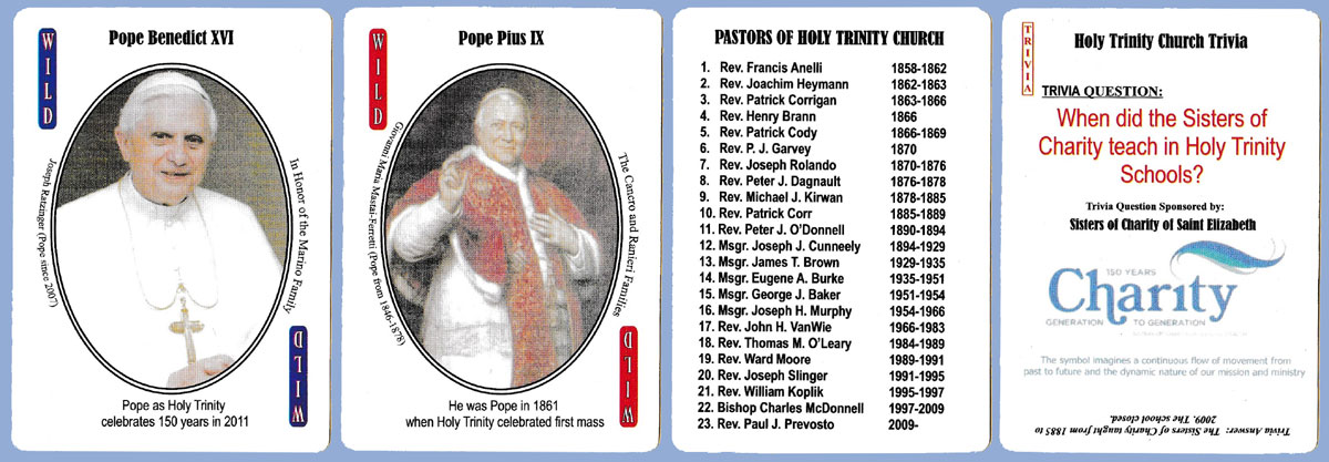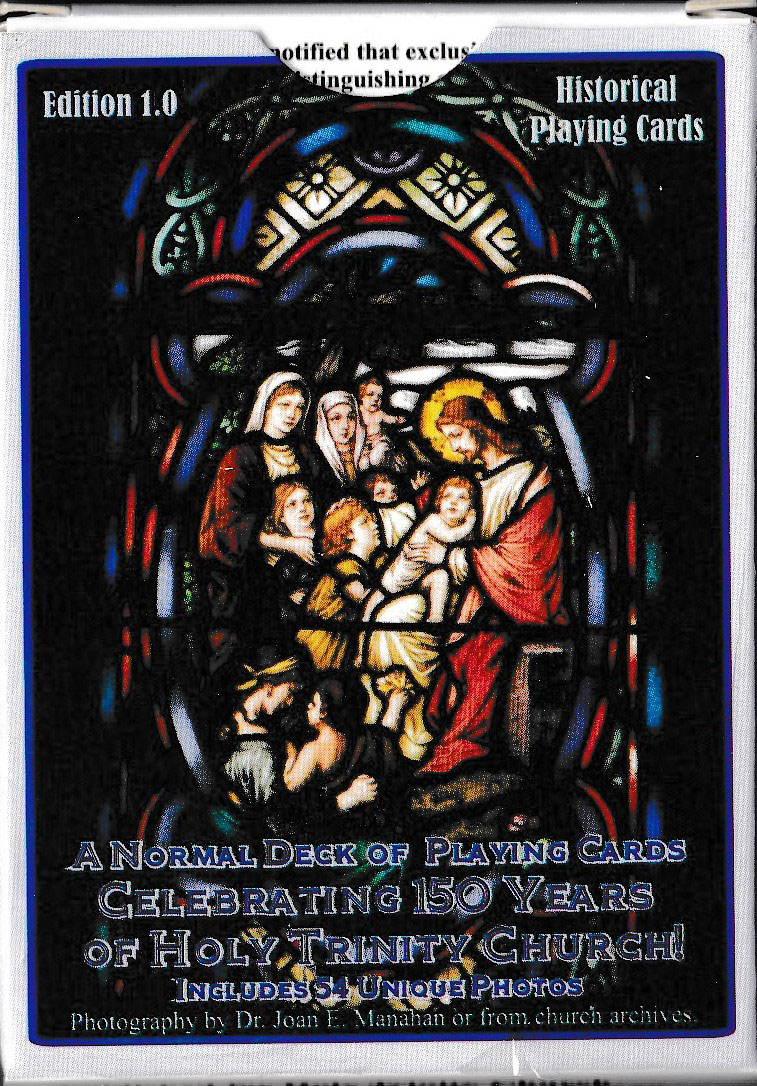 Published by Real Souvenir Playing Cards (a part of Newt’s Playing Cards) in 2011, each card portrays a pastor, vicar, bishop or reverend associated with the Church, or church relics, Madonnas, icons, tapestries, altars, etc. Saints are shown on the Queens. The two jokers are two popes: Pius IX – Pope in 1861 when the Holy Trinity was founded, and Benedict XVI – Pope in 2011 when the church celebrated 150 years. In addition, there are two "trivia" cards sponsored by local organisations.