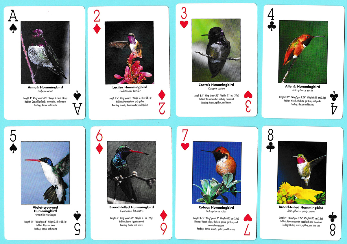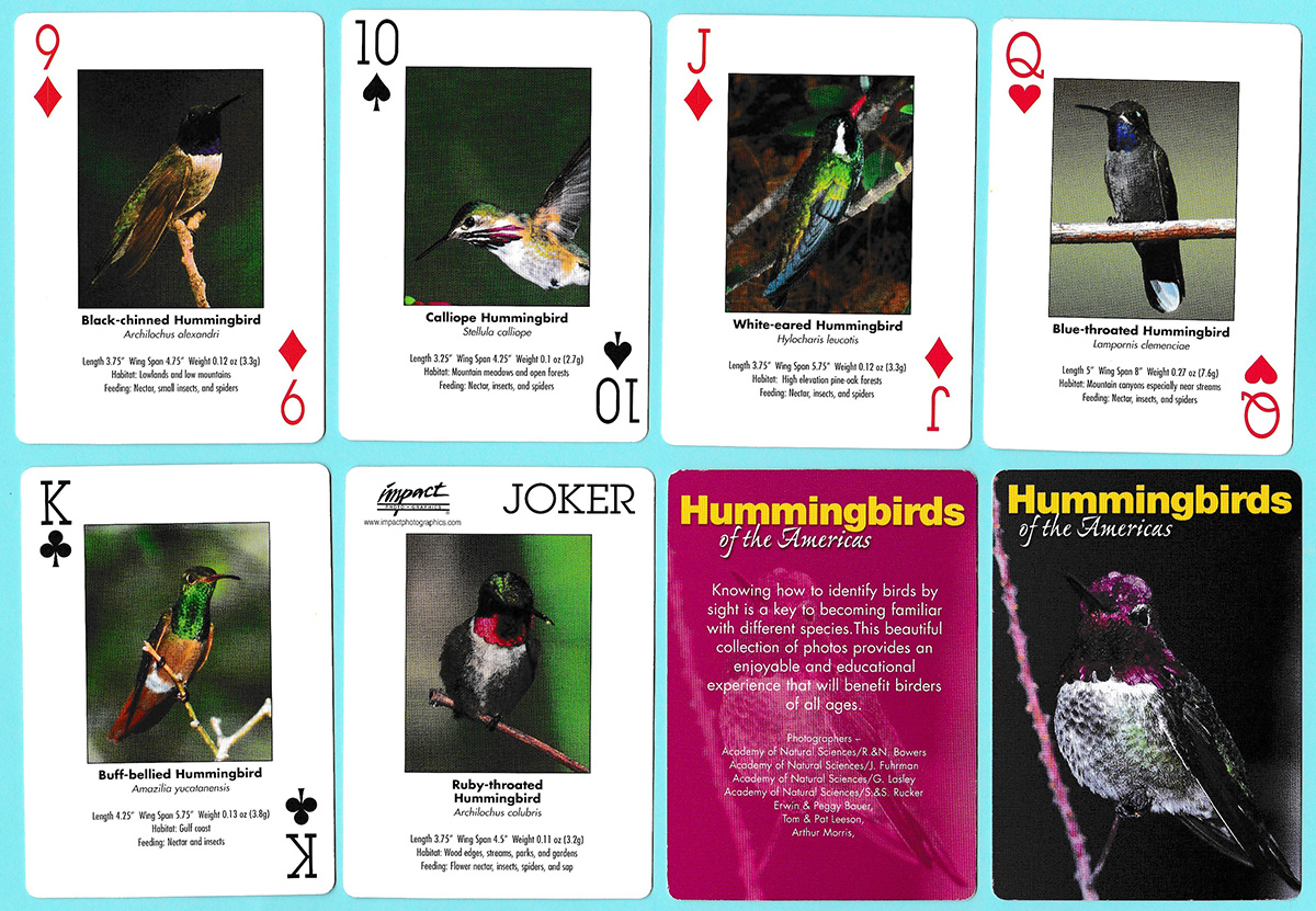 Above: Hummingbirds of the Americas playing cards produced by Impact Photographics of El Dorado Hills, CA. Undated, printed in Korea.