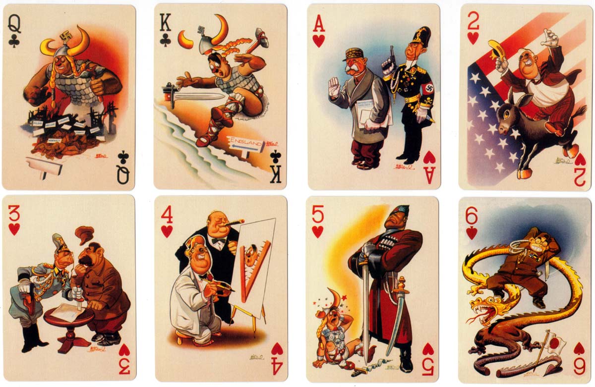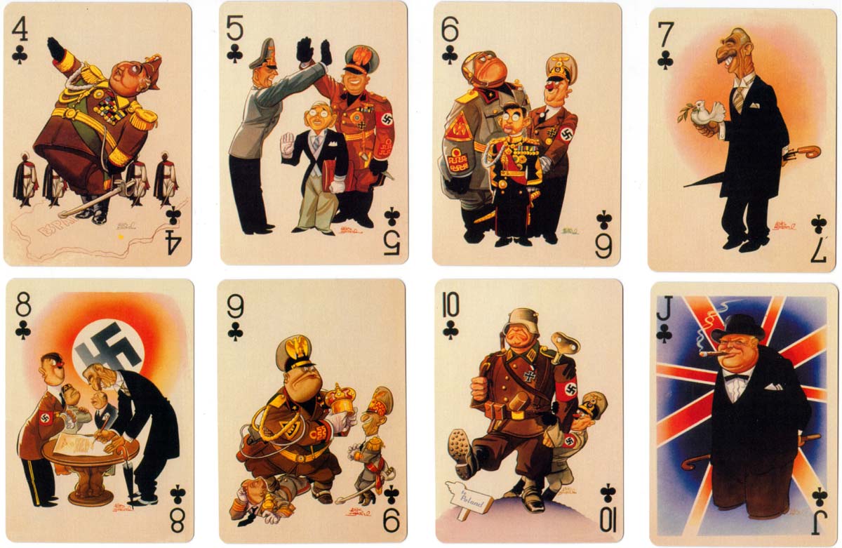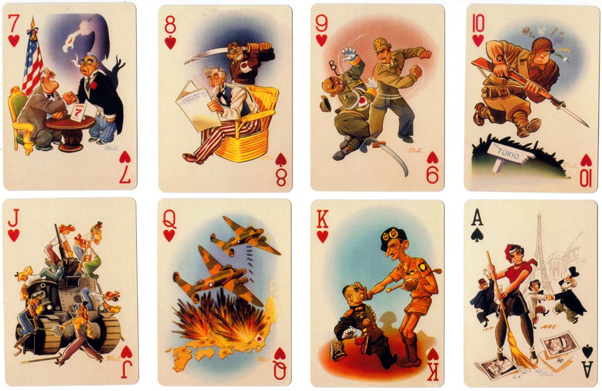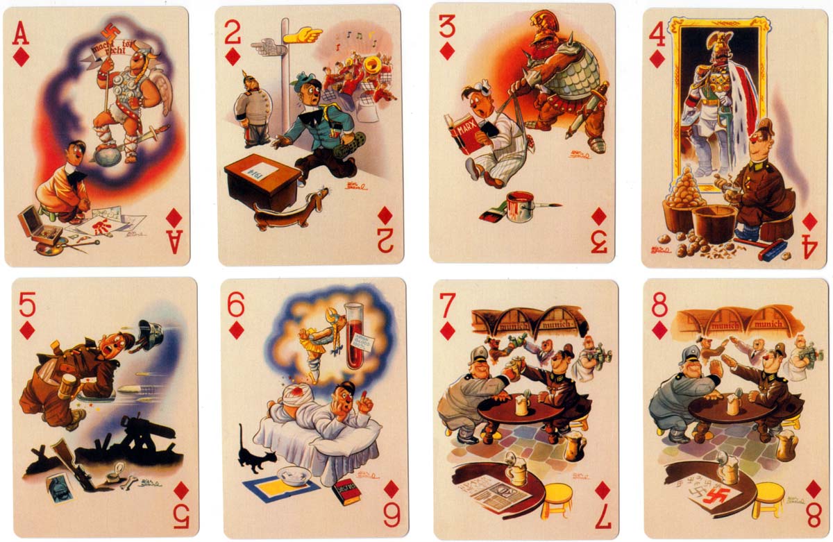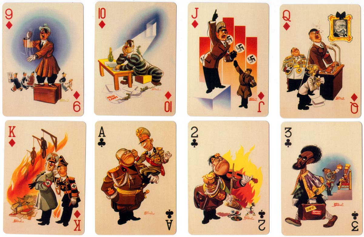 Above: “In der Fuehrer’s Face” playing cards designed in 1943-45 by Antonio Arias Bernal, a Mexican artist. By a twist of fate as soon as he had begun the paintings the war in Europe began to go the way of the Allies. Also around the same time six South American countries declared against the Axis powers so the need for the playing cards was really gone. But as he had been paid already Bernal decided to complete the task which he did by 1945. The cards follow the career of Hitler chronologically beginning with the ace of diamonds, through clubs, hearts and spades to the final King showing Emperor Hirihito crawling away from Hiroshima. However, they were not published until Bill Schroeder rediscovered them and published them in 2003. Bill Schroeder named the pack from the well known song “Der Fuehrer’s Face” by Spike Jones and his City Slickers released in 1942. This was a taunting and disrespectful parody of the Nazi song “Horst Wessel Lied” which included a lot of “raspberry blowing”. Published by Bill Schroeder & M.R. Steele, Banner Publications, Finksburg Maryland USA. Images courtesy Rex Pitts.