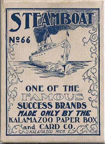 The Kalamazoo Paper Box & Card Co. commenced producing playing cards in 1903. Their first brands included Steamboats, Strollers and Success. The Steamboats deck was probably their least expensive, as was the case with most manufacturers who published a Steamboat brand. By 1906 the playing card manufacturing business had grown to such an extent that the company renamed itself Kalamazoo Playing Card Co., and was thereafter devoted exclusively to the manufacture of playing cards, having dropped the paper boxes.