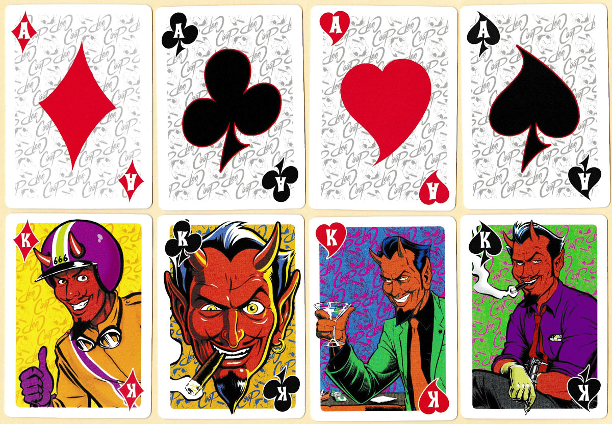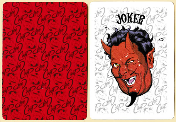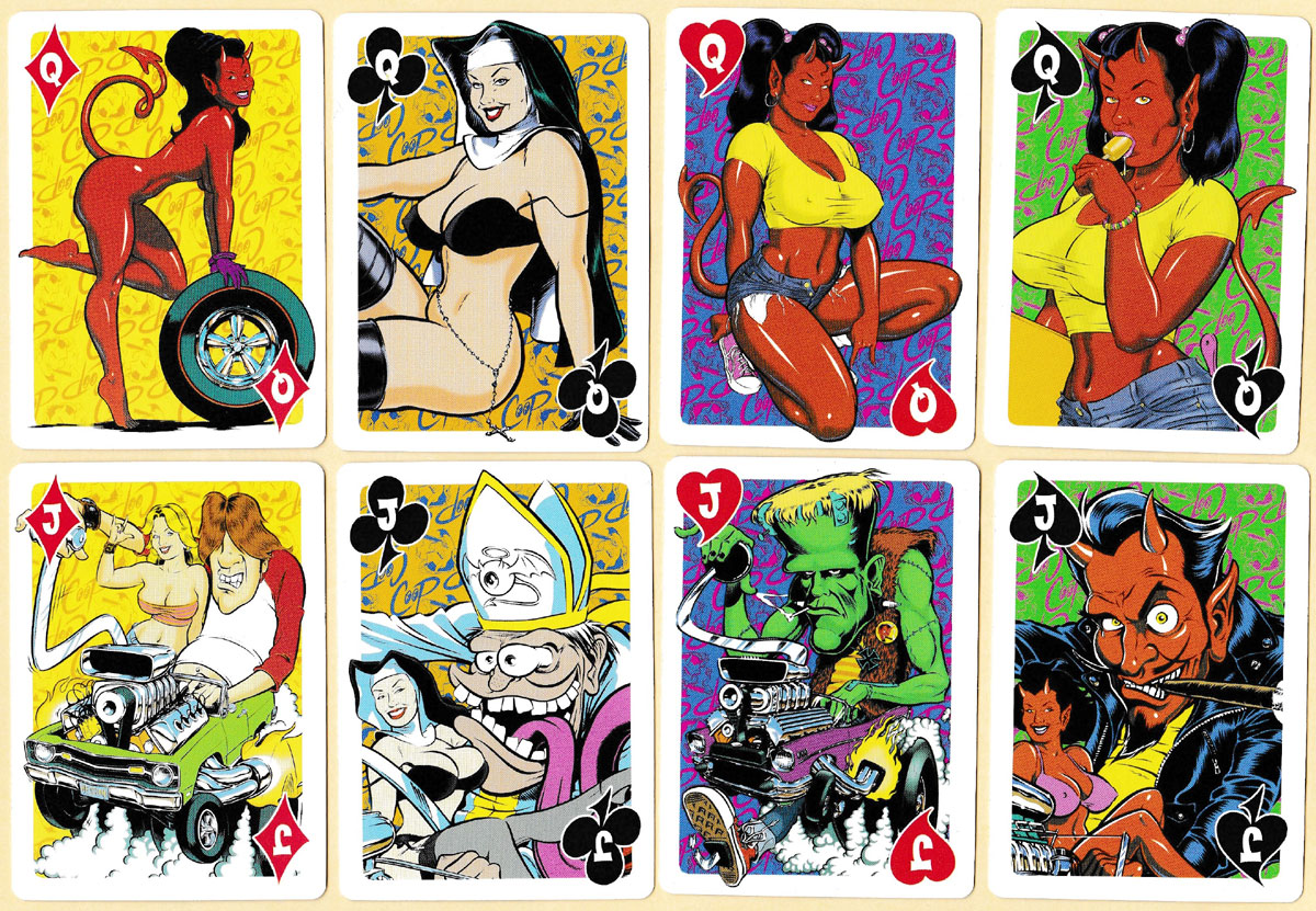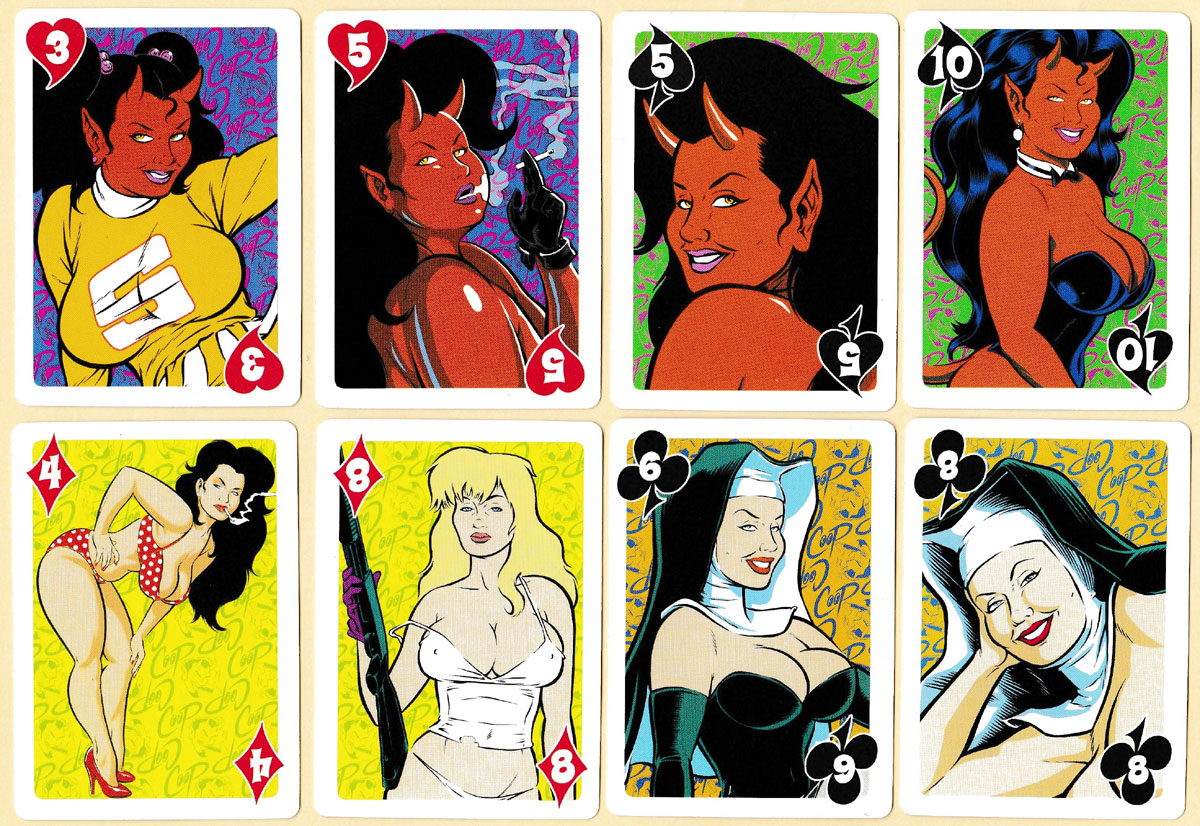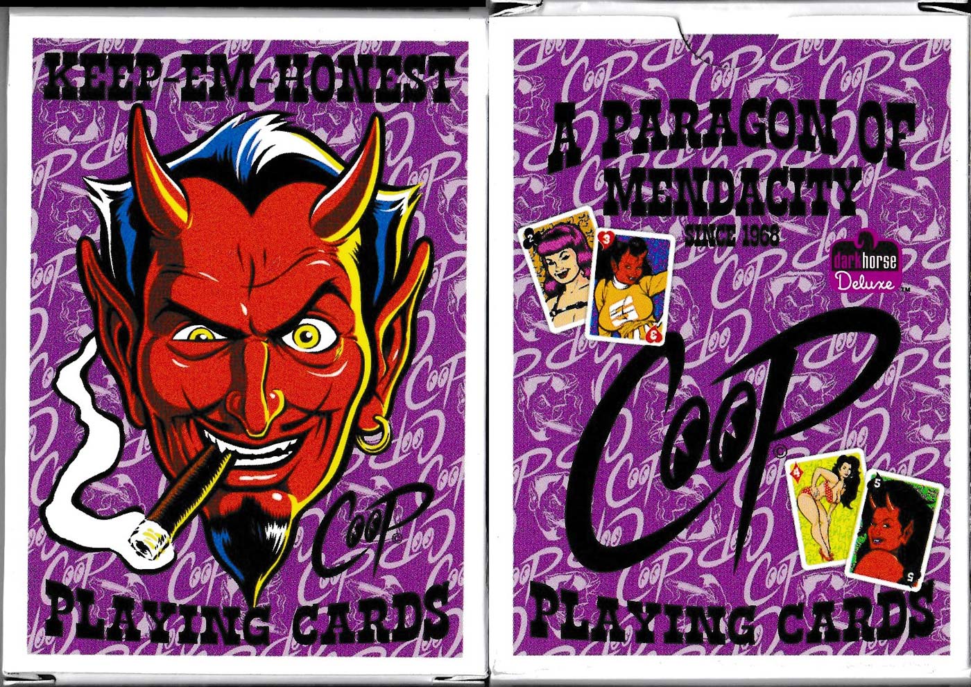 One side of the tuck box reads “Keep-em honest” while the other states “Coop playing cards: a paragon of mendacity since 1968”. Coop (real name Chris Cooper, born 1968) is an artist working from Los Angeles who describes his occupation as "Insensitive Artiste." His work consists primarily of barely clothed or nude Bettie Page-style 1950s soft pornography and B-movie monsters, with the female characters often taking the role of "Devil-Women". He additionally designs posters for rock bands.