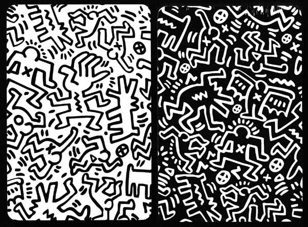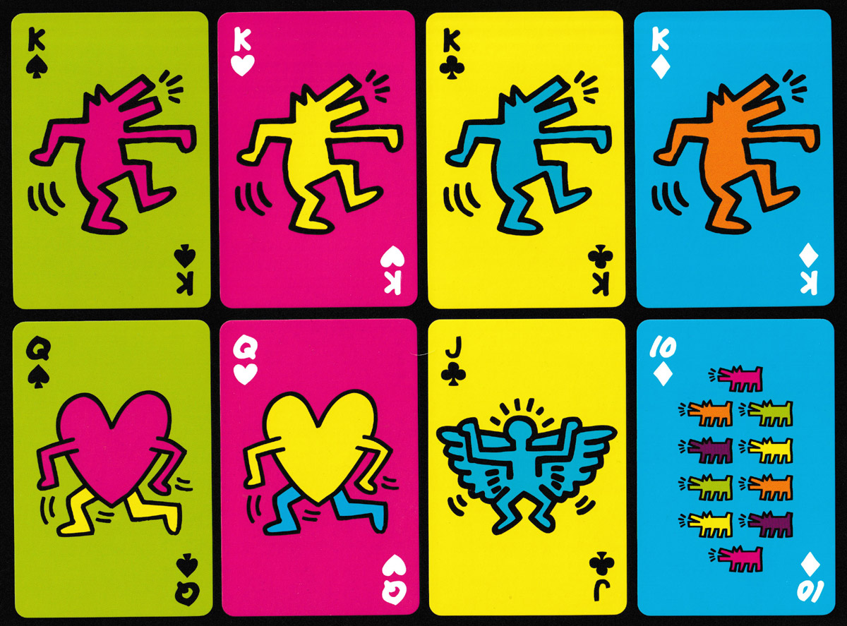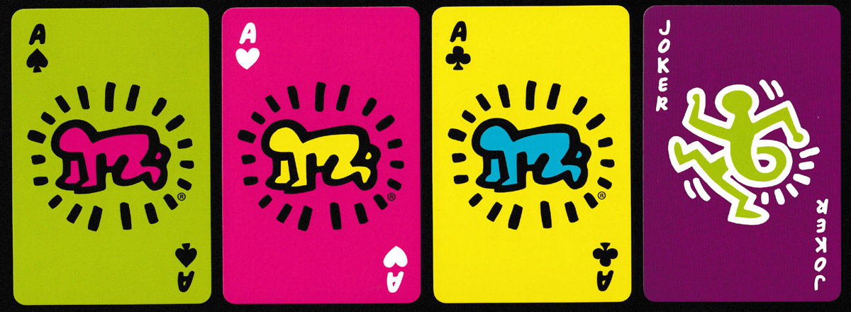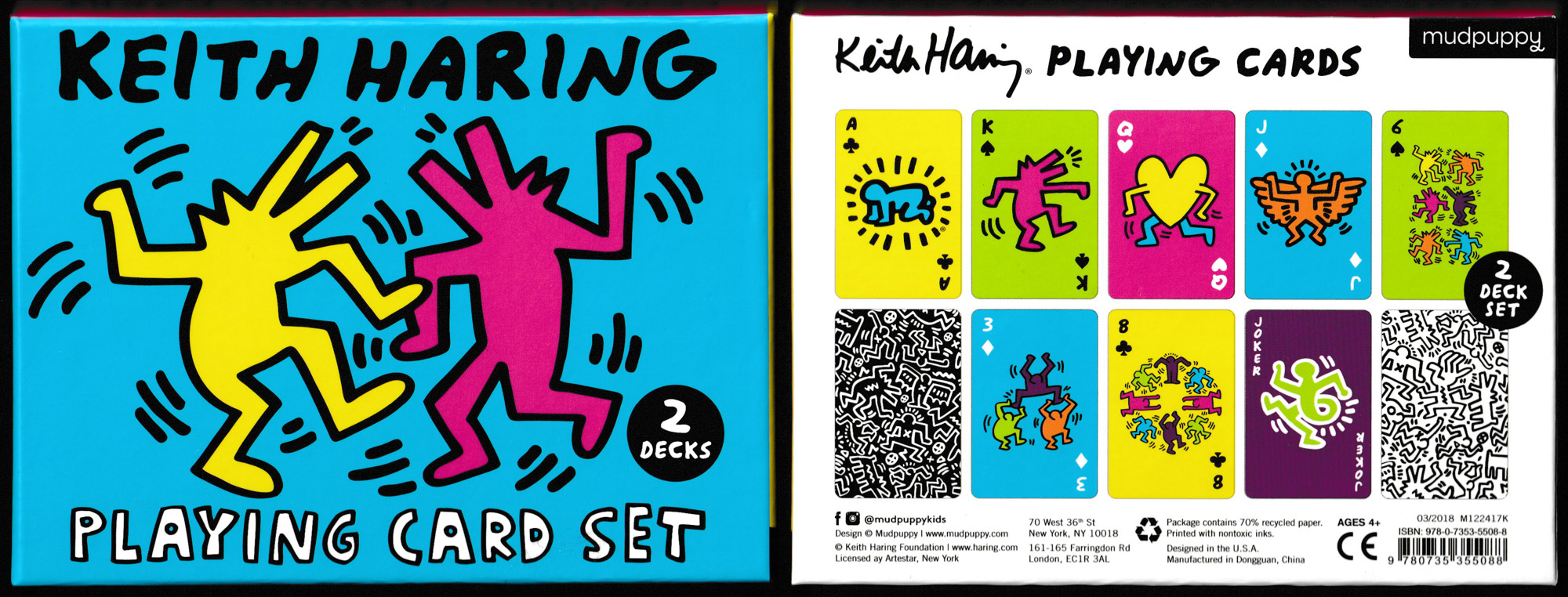 Above: Keith Haring playing cards designed in the U.S.A. Made in Dongguan, China. Published by Mudpuppy, New York, NY, U.S.A., 2018. 2 x 52 cards + 2 (identical) Jokers in tuck boxes, in double box with tray. Size: 63.5 x 95 mm. Licensed by Artestar, New York