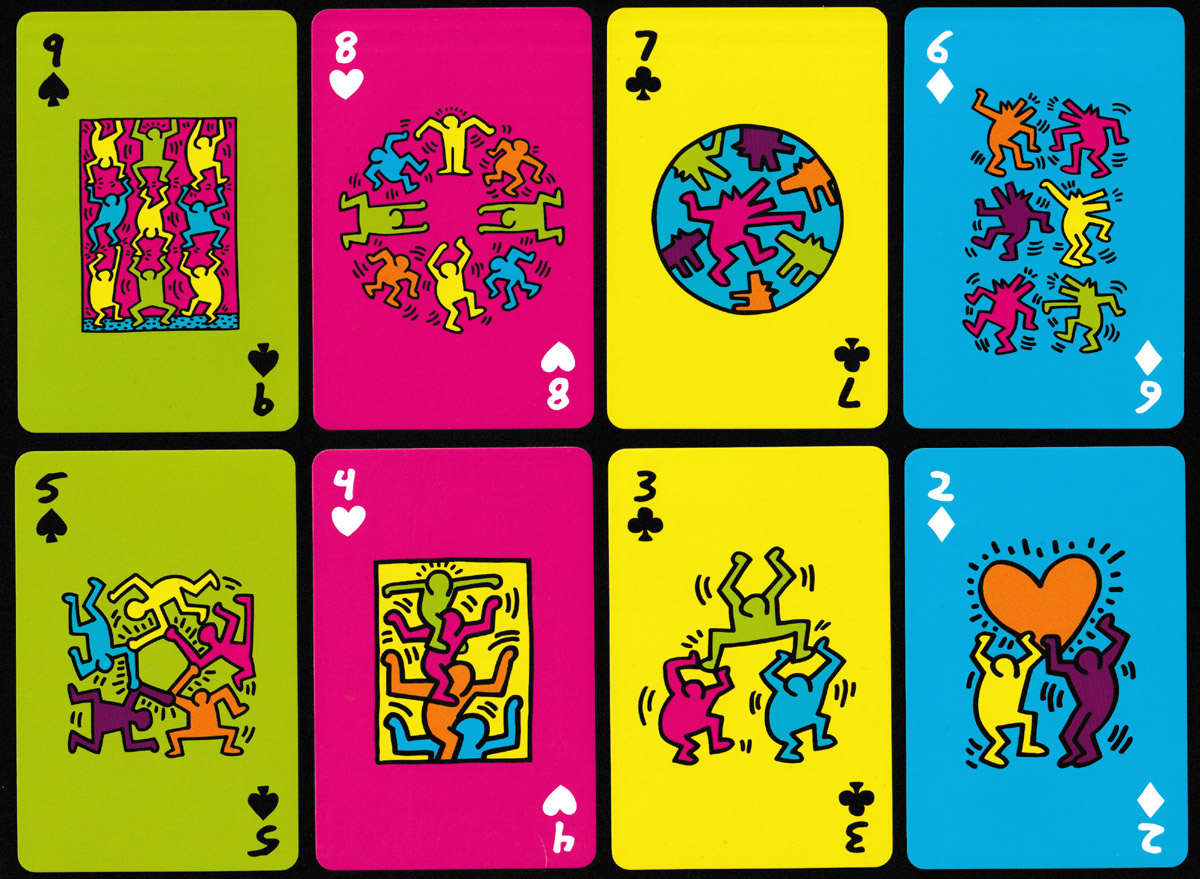 Keith Haring (1958-1990), the American graffiti artist, developed a style which became instantly recognisable, as exemplified here. Fourteen of his most familiar images, including babies, angels, dancers and barking dogs, are included in this pack. There are no borders. Apart from the Joker, the same image appears on the equivalent card in each suit, though in a different colour and with a different background colour for each suit (green – spades; magenta – hearts; yellow – clubs; blue – diamonds). This colour scheme has resulted in the hearts and diamonds being coloured white. The back designs are similar, though not identical, coloured black on white and white on black • See the outer box