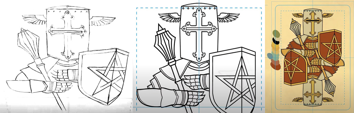 Above: Early sketches and digital drawings showing the developing of Sir Gawain on the jack of clubs.