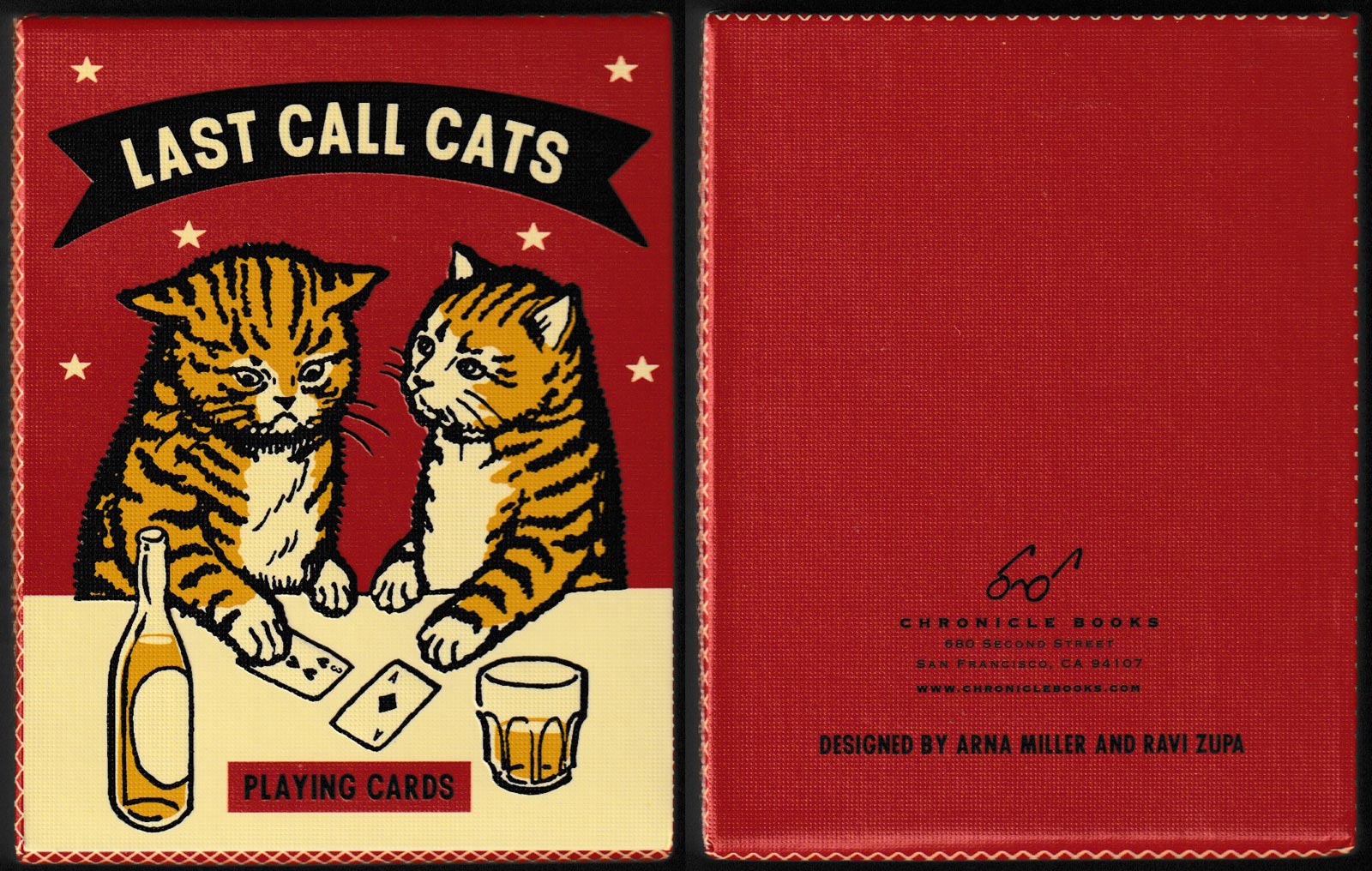 Above: Last Call Cats playing cards designed by Arna Miller and Ravi Zupa, published by Chronicle Books, San Francisco, CA, USA, 2021. Made in China. 52 cards + 2 (identical) Jokers in solid telescopic box. Size: 63.5 x 89 mm. © 2021 by Arna Miller and Ravi Zupa.