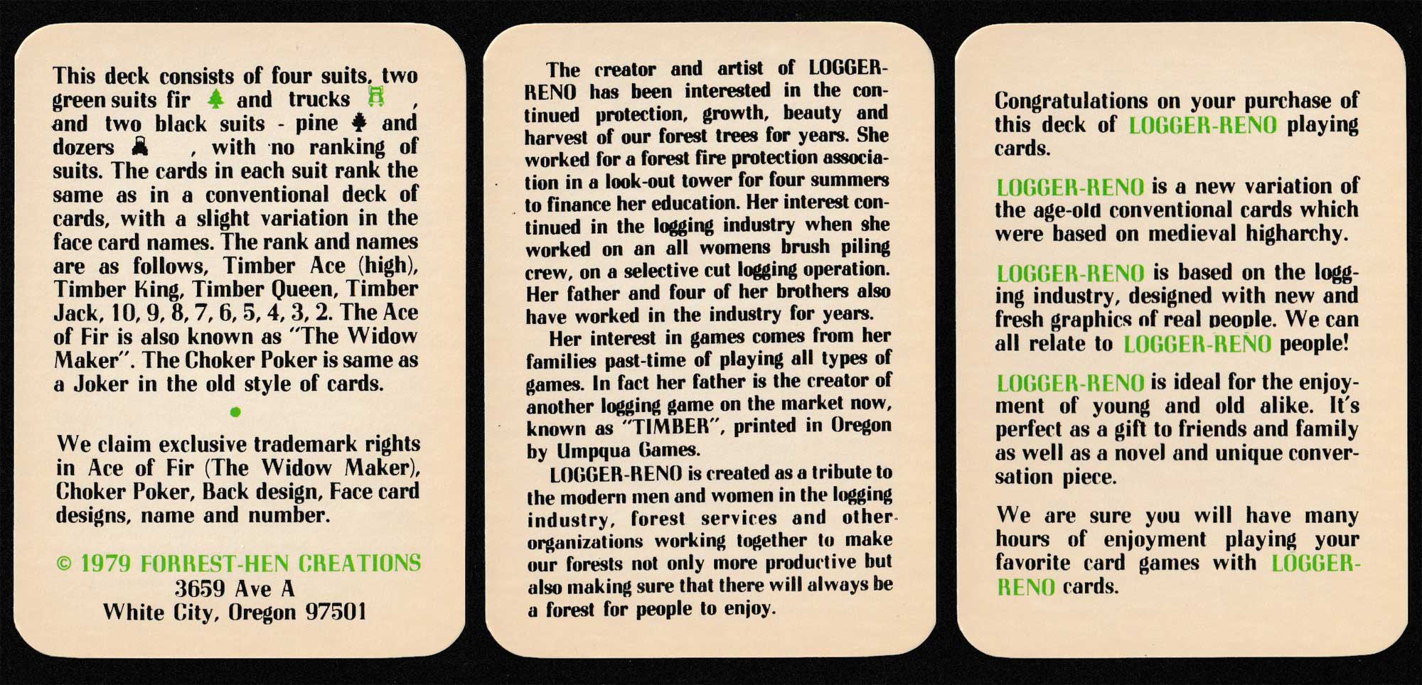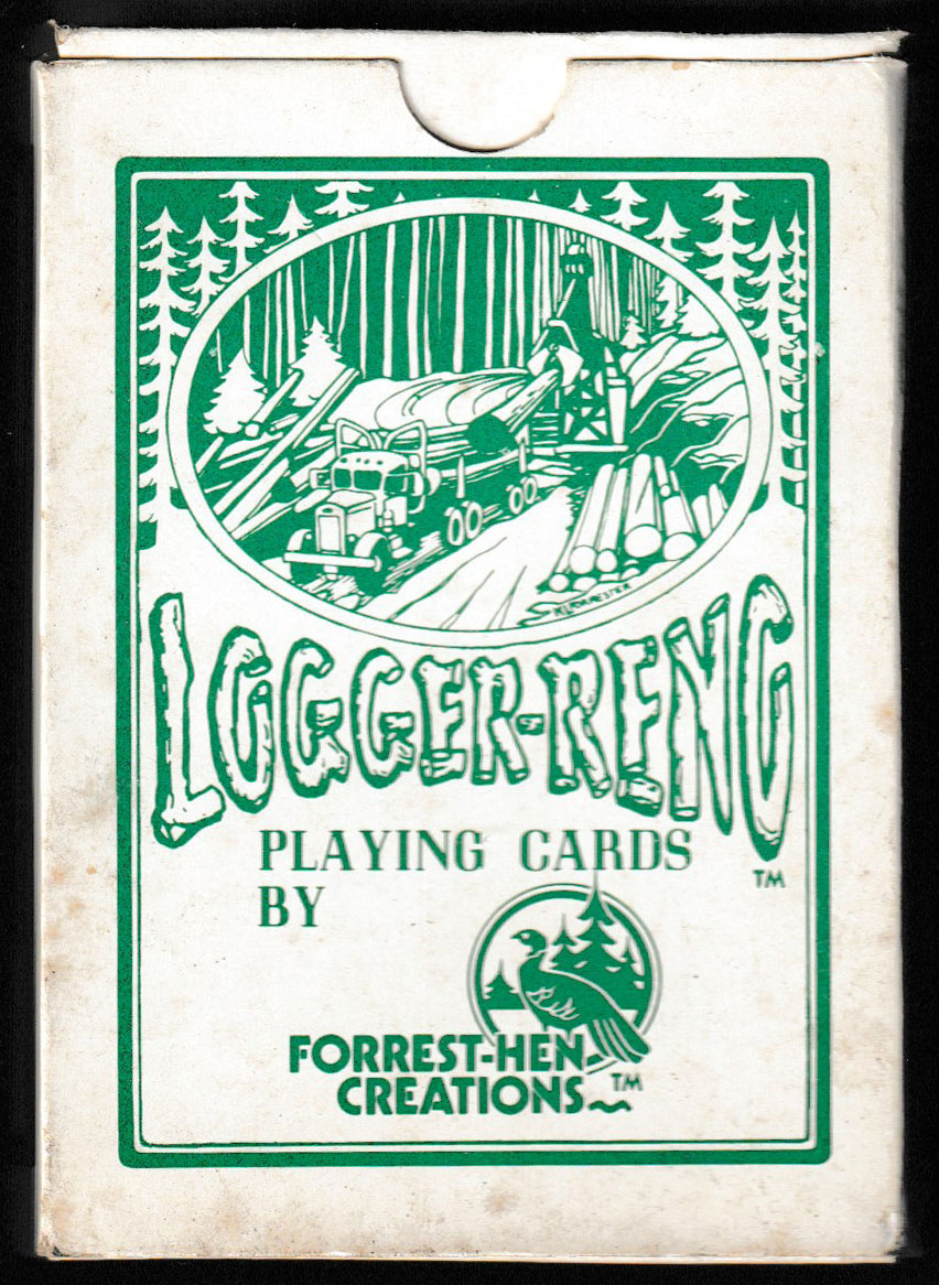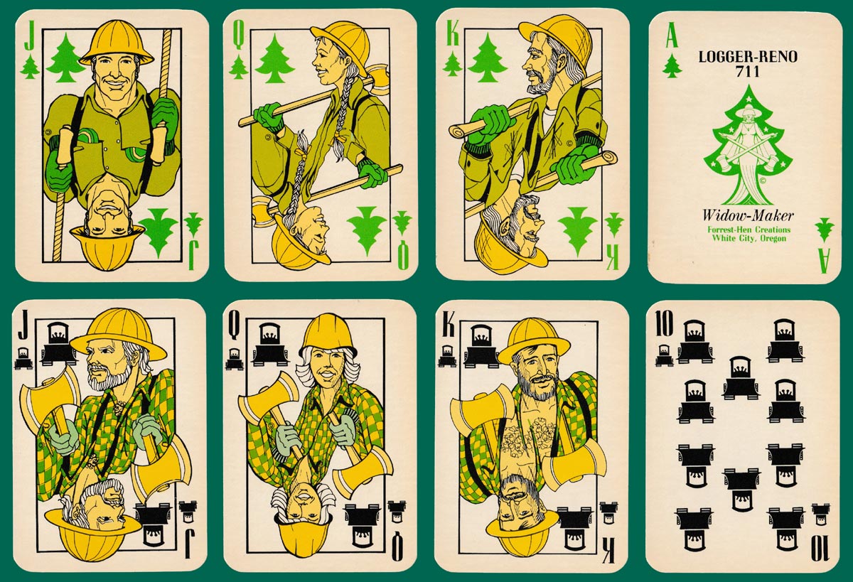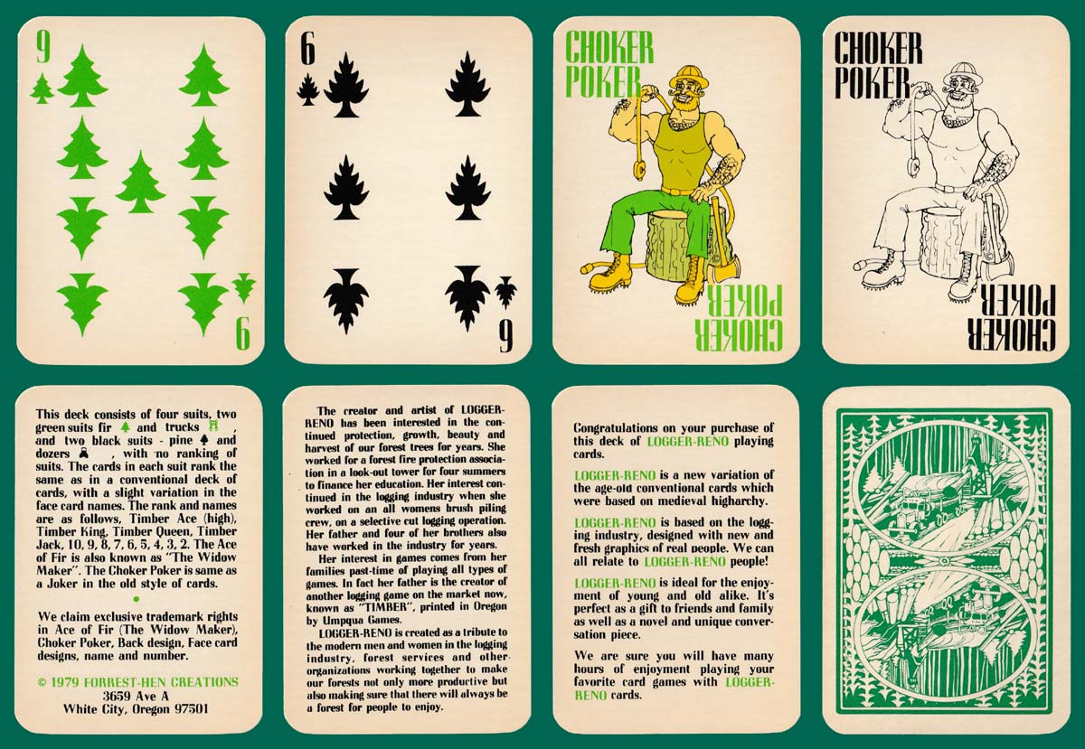 Above: Logger-Reno 711 playing cards published by Forrest-Hen Creations, White City, Oregon, USA, 1979. Maker unknown. 52 cards + 2 Choker Poker cards + 3 extra cards in tuck box. Size: 63 x 88.5 mm. (Click on extra cards to ZOOM).