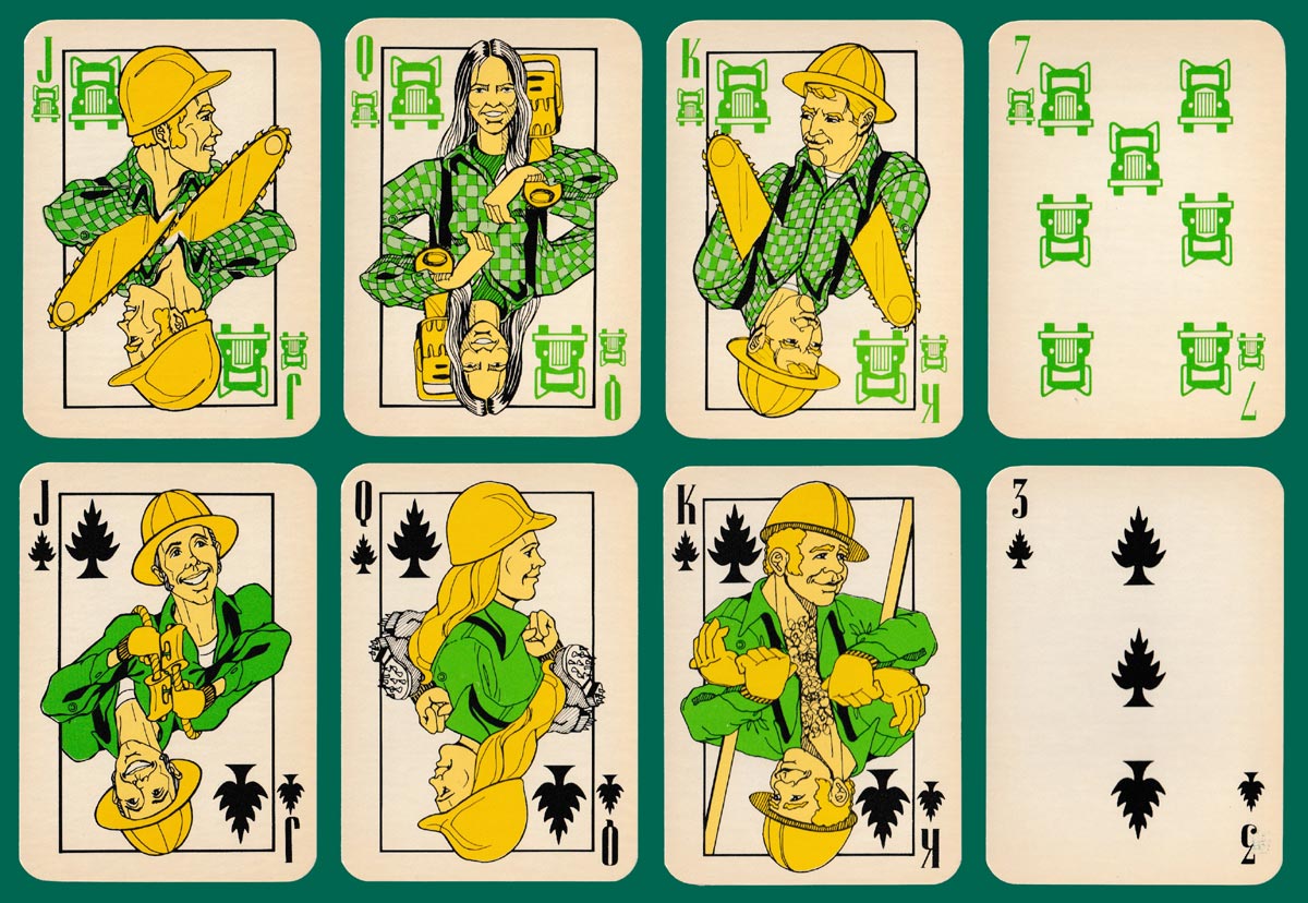 Shades of green, yellow and black are the predominant colours in this pack created as a tribute to the modern men and women in the logging industry. The designer is a woman but her name is not revealed. There are two green suits (fir trees and trucks) and two black suits (pine trees and bulldozers). The Ace of Fir(s) is called “The Widow Maker”, while Choker Poker cards replace the Jokers. There is a pleasing unity to the designs in that the courts wear an identical colour and pattern of clothing within each suit. The double-ended design on the reverse depicts a logging scene in green. Further explanation is provided on the three extra cards. “MADE IN OREGON” is stamped on each side of the box. See the box►