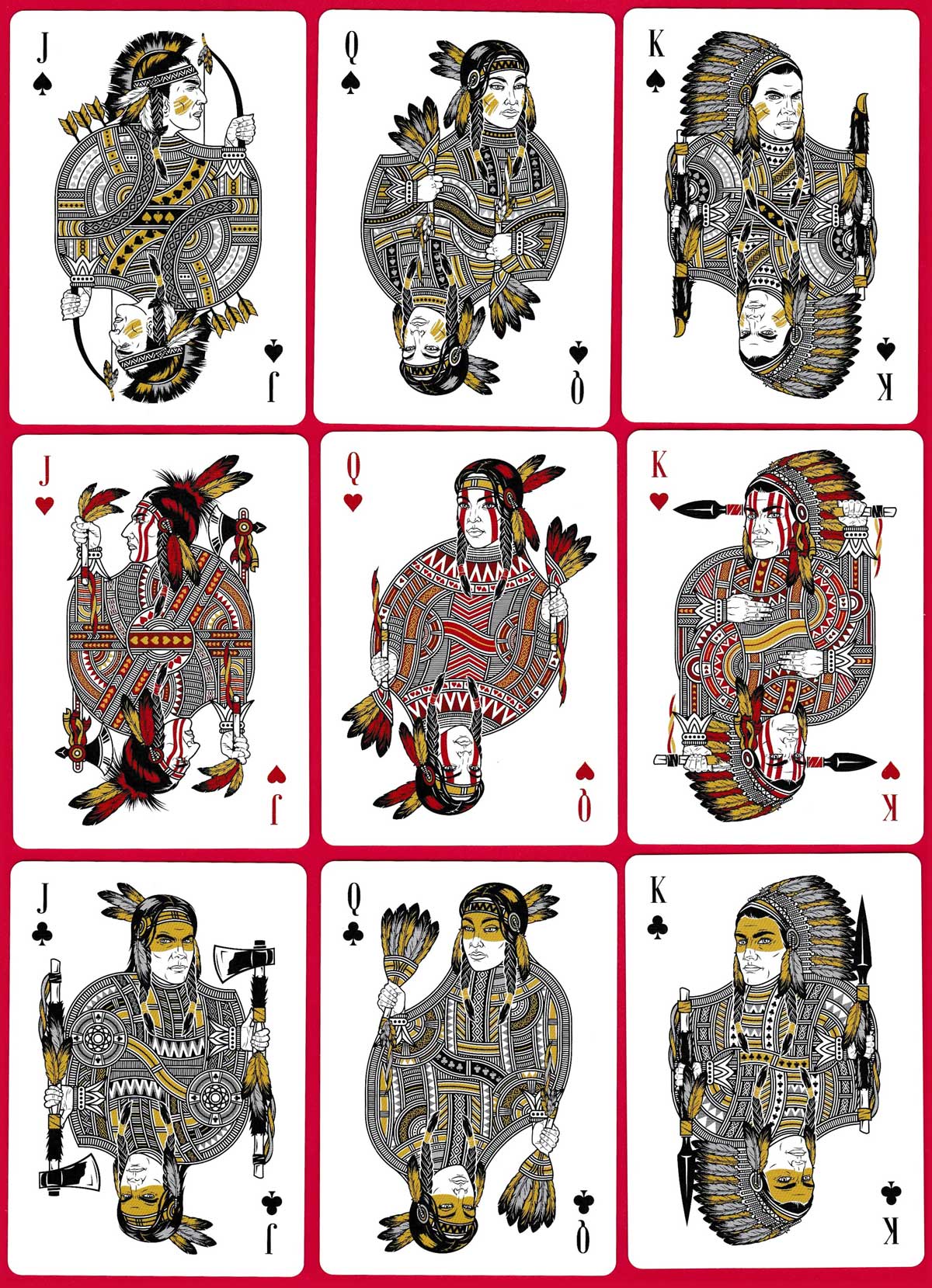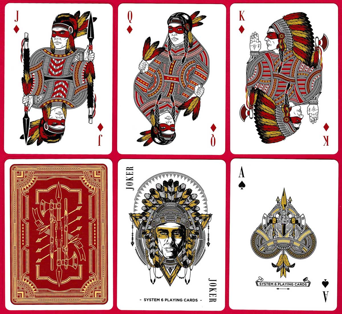 The tomahawk, arrows and spears figure prominently on the back of the cards (within a decorated gold border), the Ace of Spades, and in the court images. The two Jokers show a Native American wearing a headdress. A custom red tuck case, along with gold foil and embossing, adds to the luxurious feel of these cards. See the box►