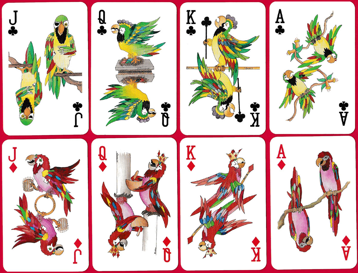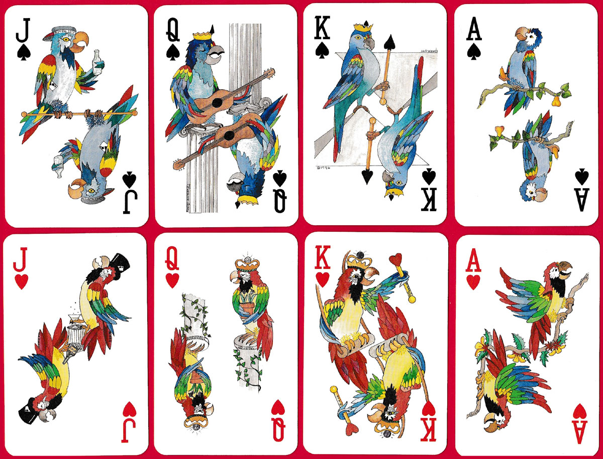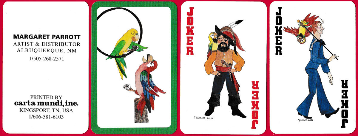This pack of cards was printed by Carta Mundi, inc., Kingsport, Tennessee and was created by Margaret Parrott, an artist and distributor living in Albuquerque, New Mexico. While the pip cards are standard, the aces, court cards and the two jokers are decorated with whimsical parrots (her “family icon”) in bright tropical colours. The cards were originally distributed as single and double packs in a clear Lucite box.