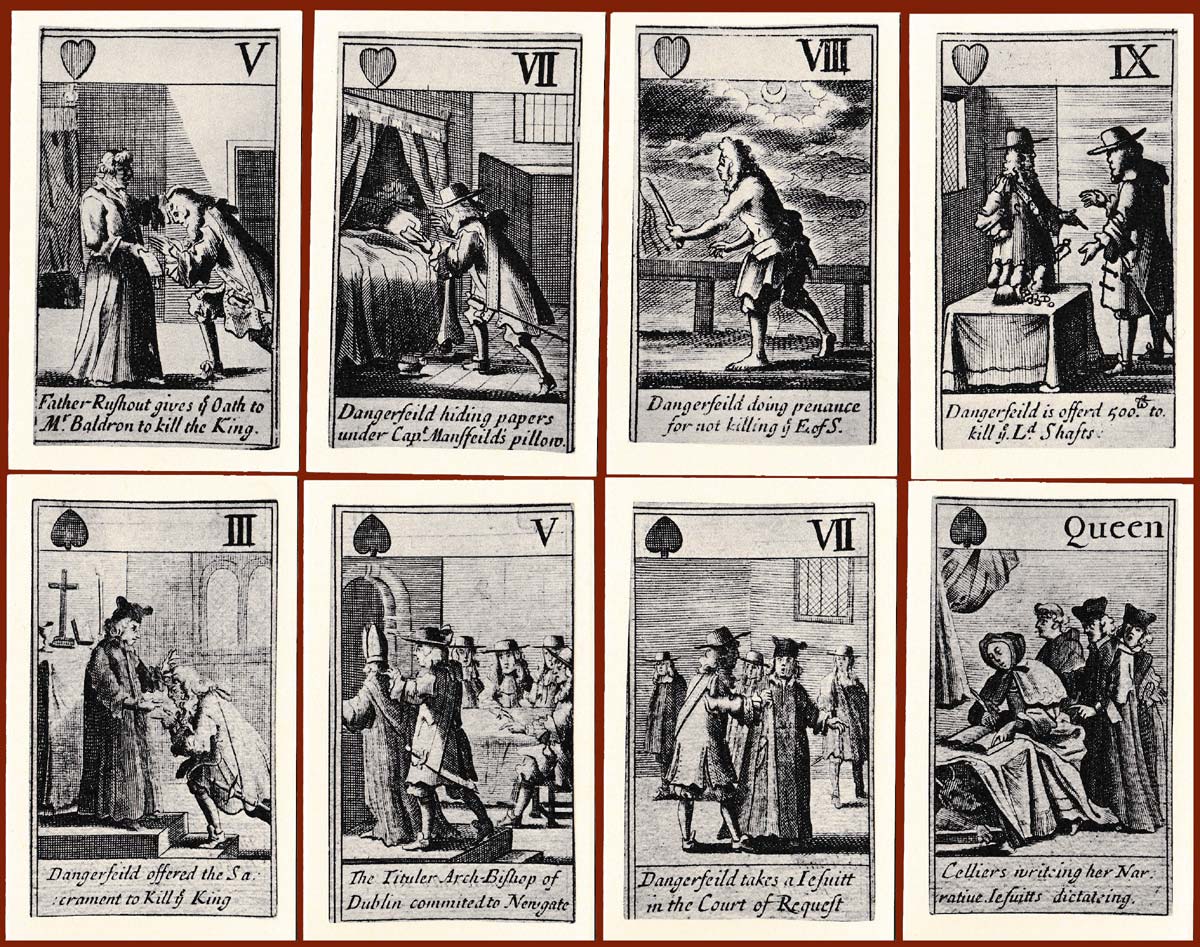 This facsimile of the fictitious anti-Catholic Meal Tub plot against the future King James II was published by Harold & Virginia Wayland, in 1971, in a limited edition of 275 packs. It reproduces the original sketches of Francis Barlow (1626-1704) made in the period 1678-1679 and published in 1680 by Randal Taylor, London. The cards were reproduced from the only complete pack held by the Worshipful Company of Makers of Playing Cards. The two protagonists in this plot were Mrs Cellier, in whose house the incriminating documents of the alleged plot were found in a meal tub (more information here), and Thomas Dangerfield (1650-1685) who pretended to have discovered this Catholic plot against the monarchy.