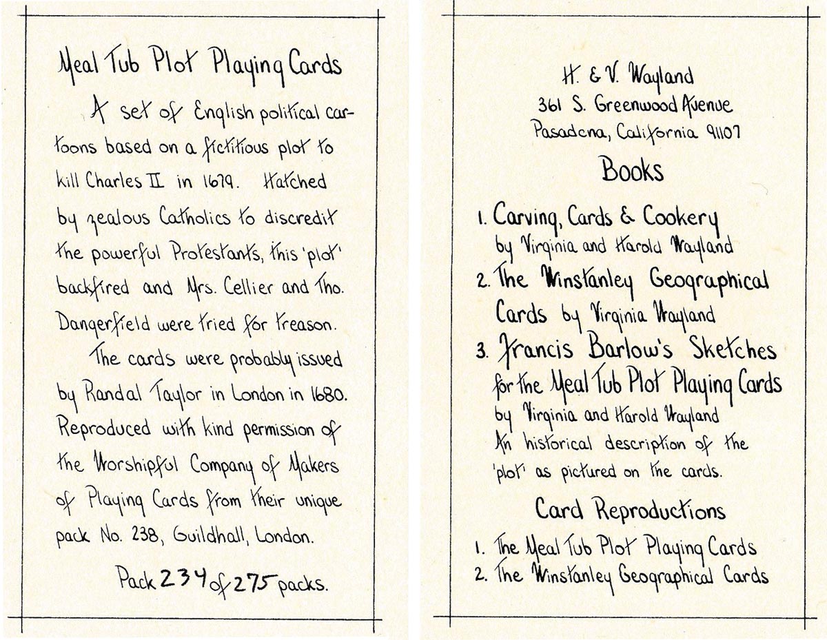Harold and Virginia Wayland published simultaneously a book (in a limited edition of 200 copies) entitled Francis Barlow’s sketches for the Meal Tub Plot playing cards, with introductory notes and an account of the Plot in relation to its times.