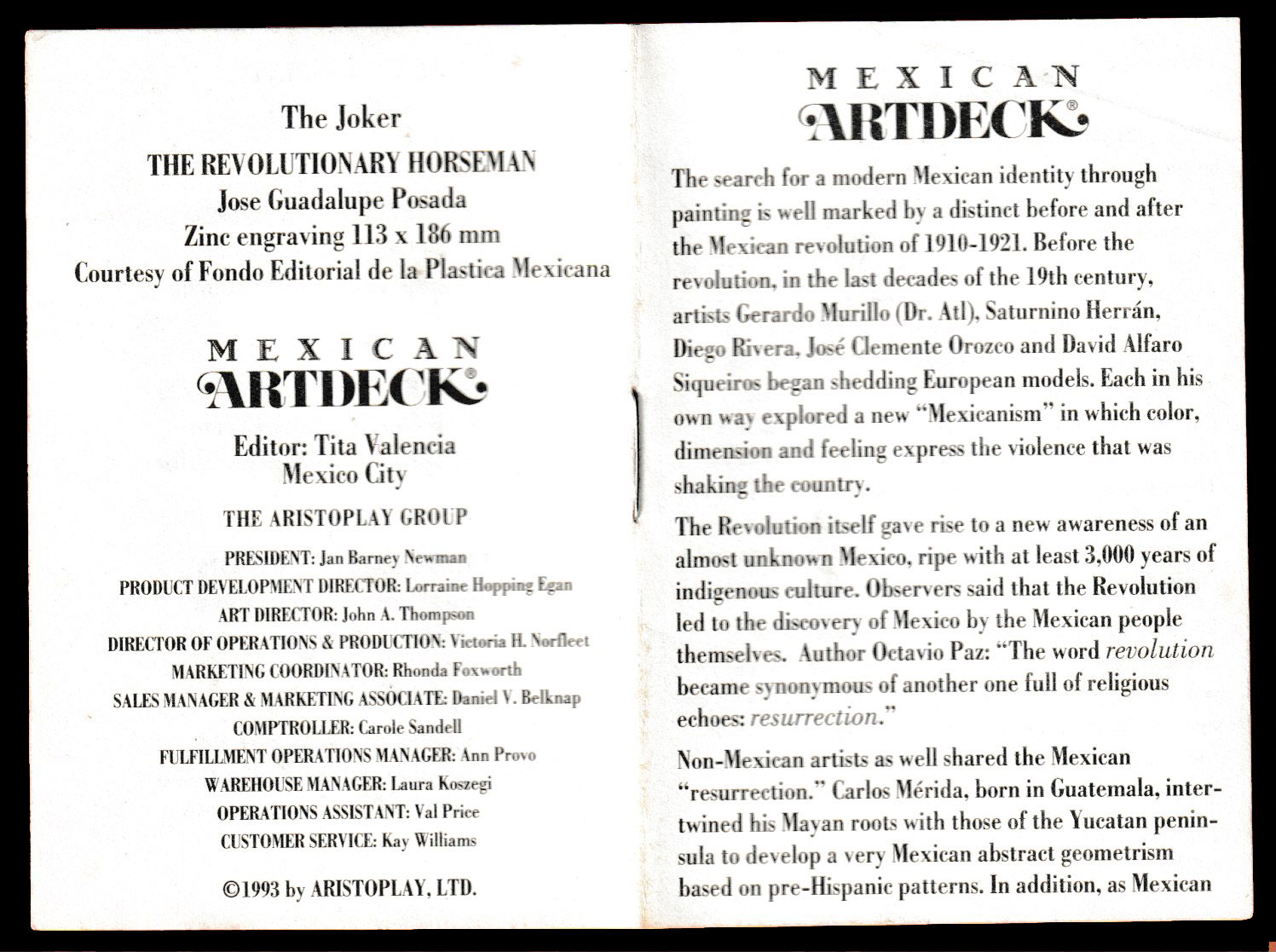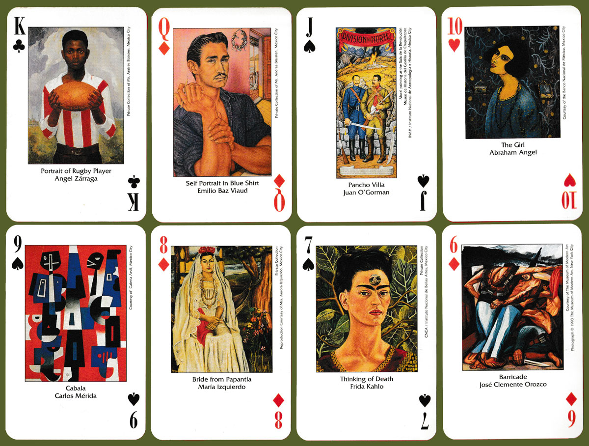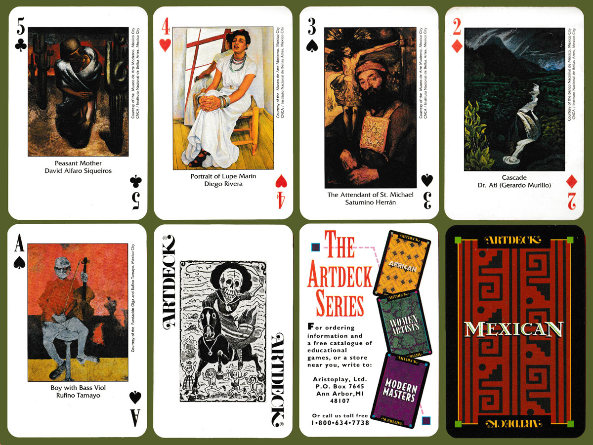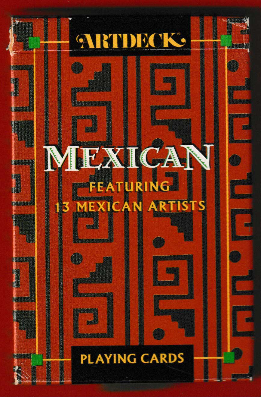 Above: Mexican Artdeck printed by Carta Mundi, Turnhout, Belgium, for Aristoplay, Ltd, Ann Arbor, MI, USA, 1993. 52 cards + 2 (identical) Jokers + 1 extra card + 16-page booklet in English, in tuck box (the 7 of Spades is reproduced on the back of the box). Size: 65 x 100 mm. ©1993 by Aristoplay, Ltd.