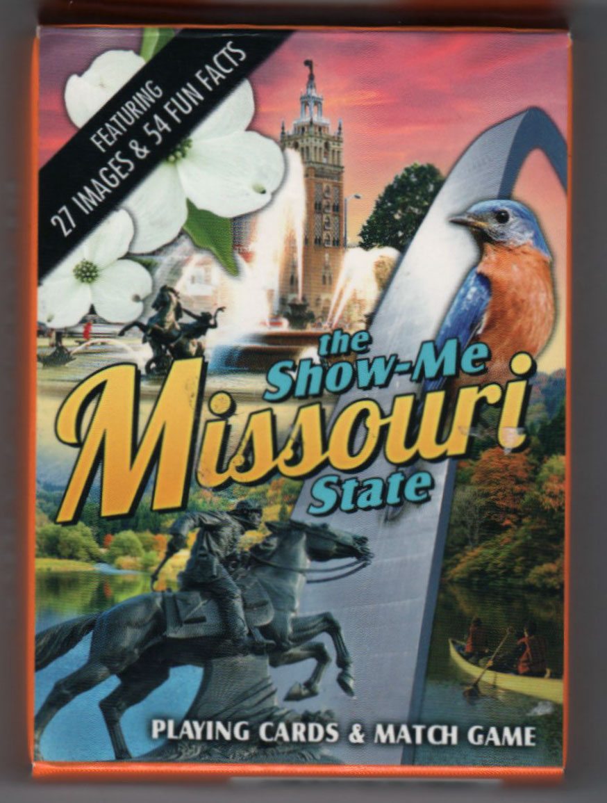 Missouri Souvenir playing cards designed by OnPoint Speciality products in the USA, 2017. Each card has a photo, the red and black cards repeat the same image so the cards can be used to play “pairs”. See the Box►