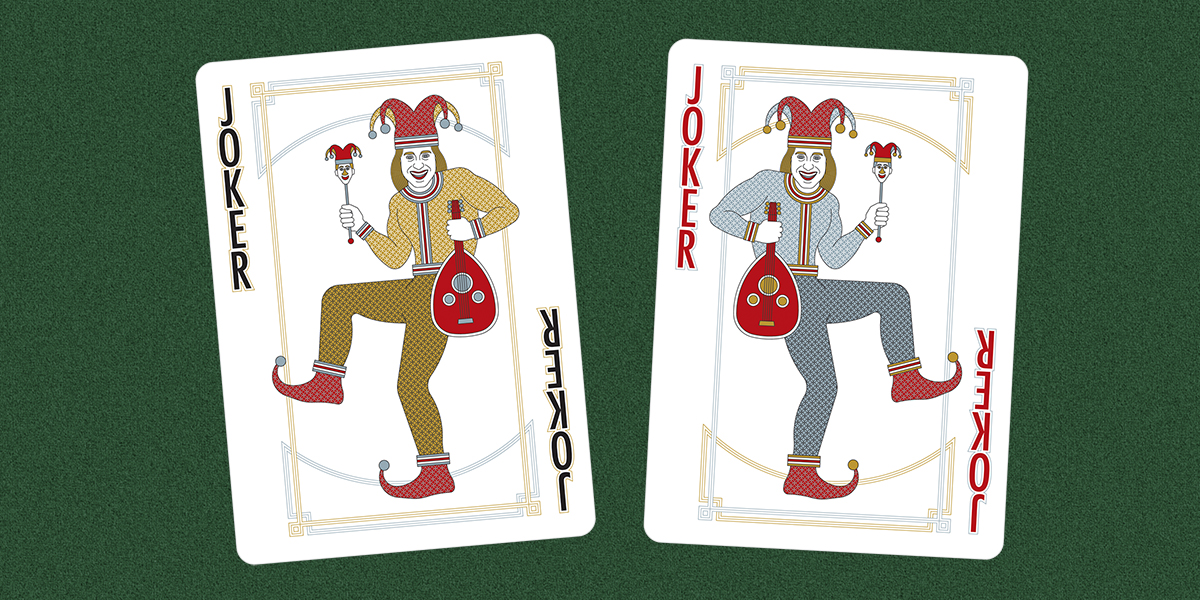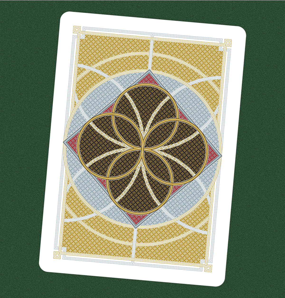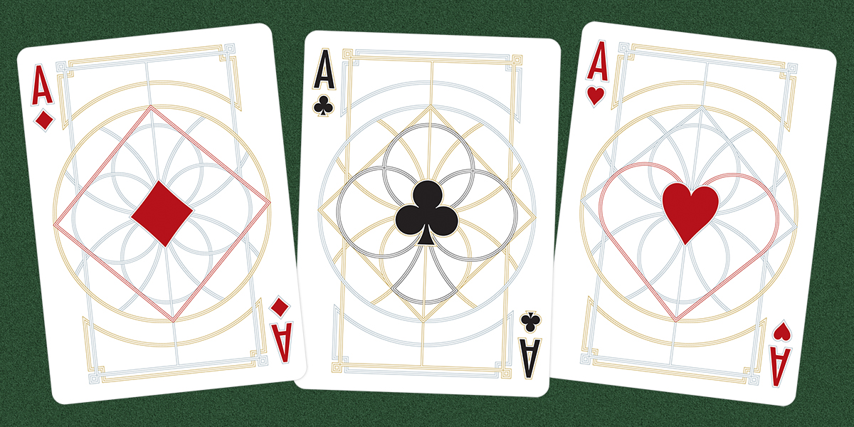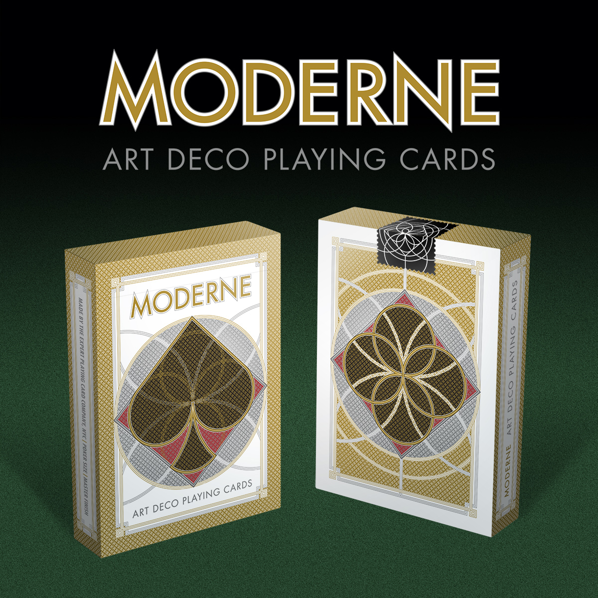 Moderne Art Deco Playing Cards are designed and illustrated by Randy Coffey. Inspired by an Art Deco style which was popular in the 1920s and 1930s. Randy has mixed Art Deco shapes with the well-known classic elements of modern English playing cards and traditional details like scepters, flowers, leaves and and orb to create an attractive new deck.