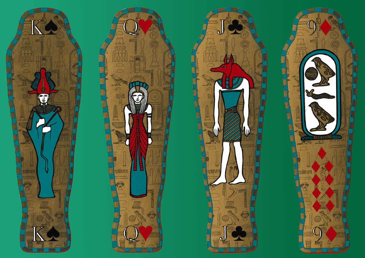 The novelty value of these cards lies in the fact that they are die-cut in the shape of an Egyptian sarcophagus (c.700-675 B.C.). The designs themselves, though colourful, are less exciting, with just one design used for the four Kings, one for the four Queens, one for the four Jacks, one for the four Aces, one for all the pip cards, and one for the two Jokers. The backs of the two packs bear the top and bottom designs of an ancient sarcophagus from the Egyptian Antiquities Collection of the Museum of Fine Arts, Boston (as shown on the back of the box). Kyung Mi Ahn is credited with the design of the cards. The cards are quite easy to hold but less easy to shuffle! See the box►