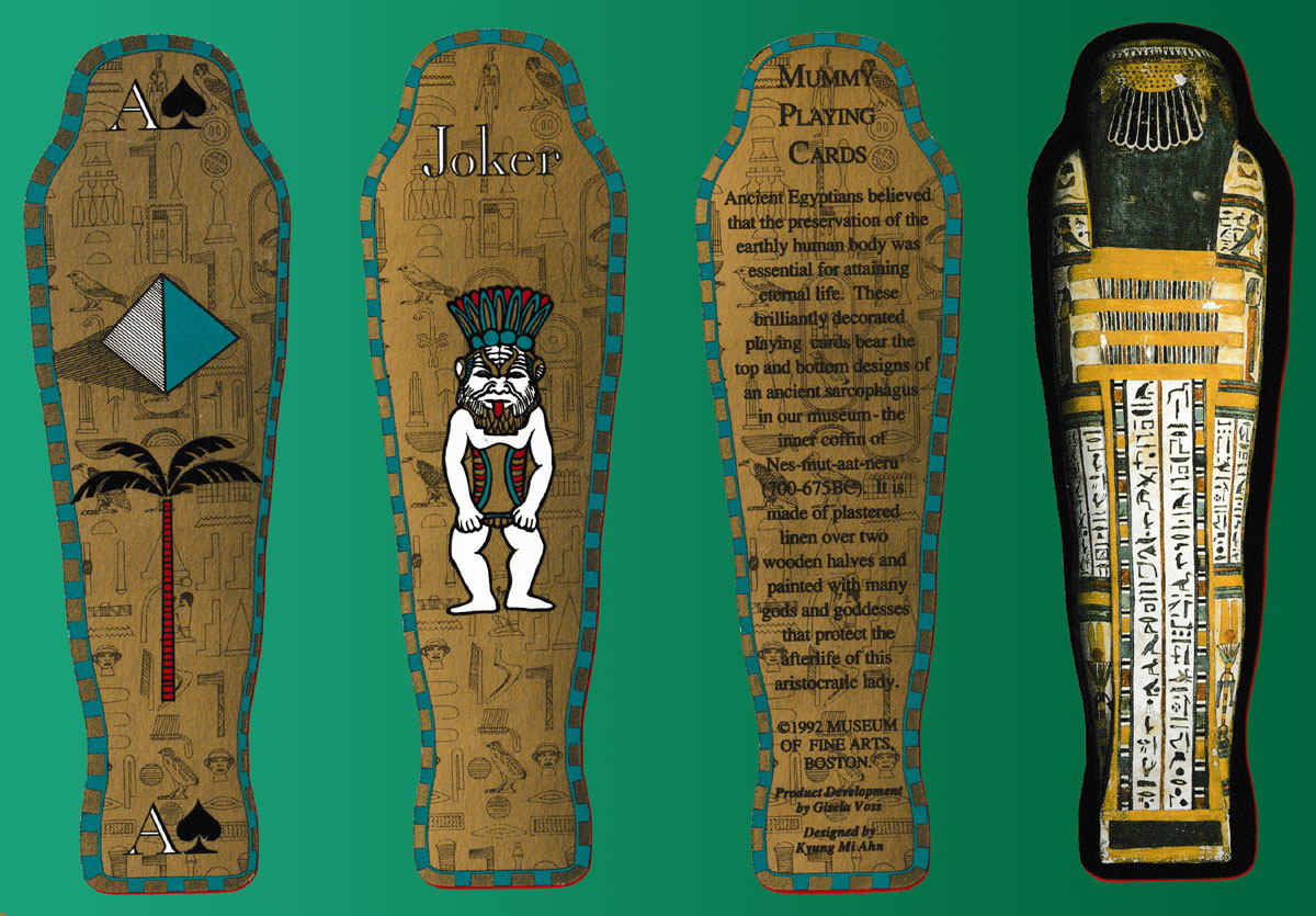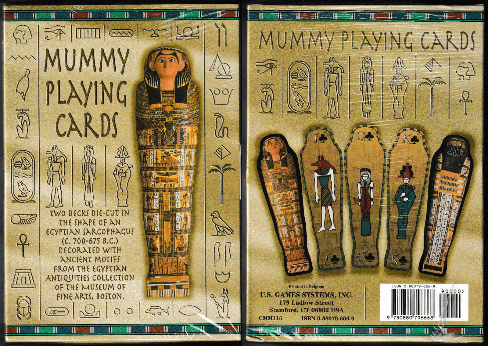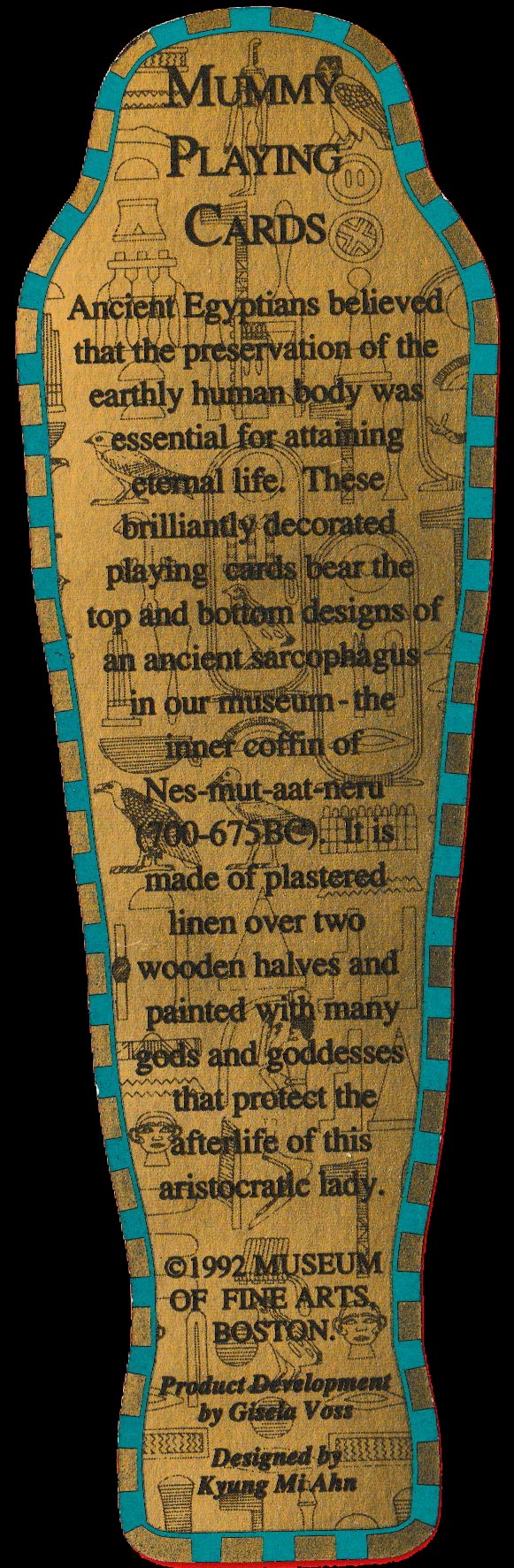 Above: Mummy Playing Cards made by Carta Mundi, Turnhout, Belgium, for U.S. Games Systems, Inc., Stamford, CT, USA, 1992. 2 x 52 cards + 2 (identical) Jokers + title card in presentation box. Size: 46 x 149 mm. (click image to zoom the info card).