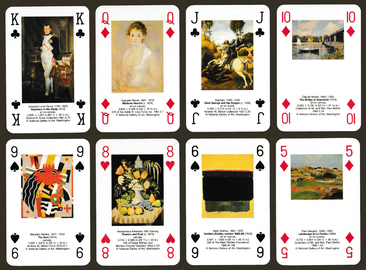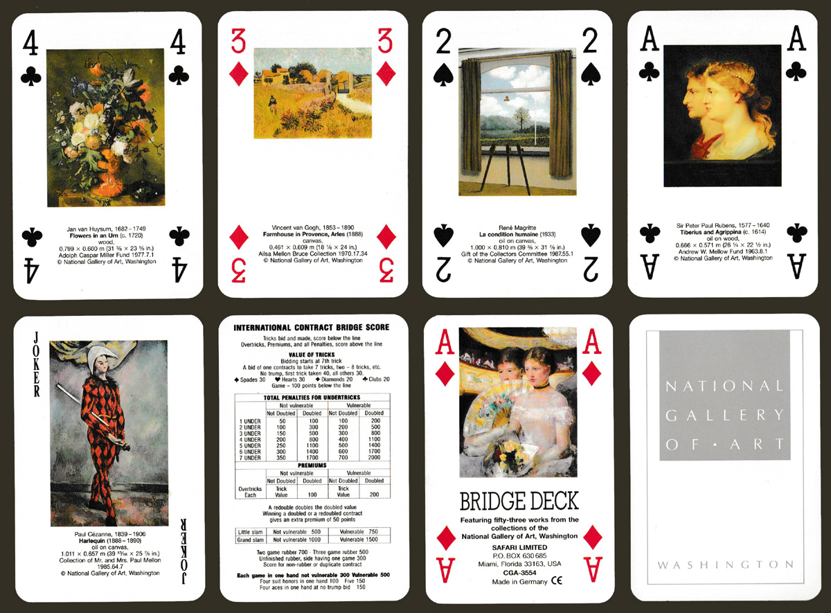 Above: National Gallery of Art souvenir playing cards published by Safari Limited, Miami, FL, USA, c1995. Made in Germany (probably by A.S.S.). 52 cards + 2 (identical) Jokers + 1 bridge score card + 1 title card (with blank back) in clear plastic box. Size: 58 x 88 mm. © National Gallery of Art, Washington