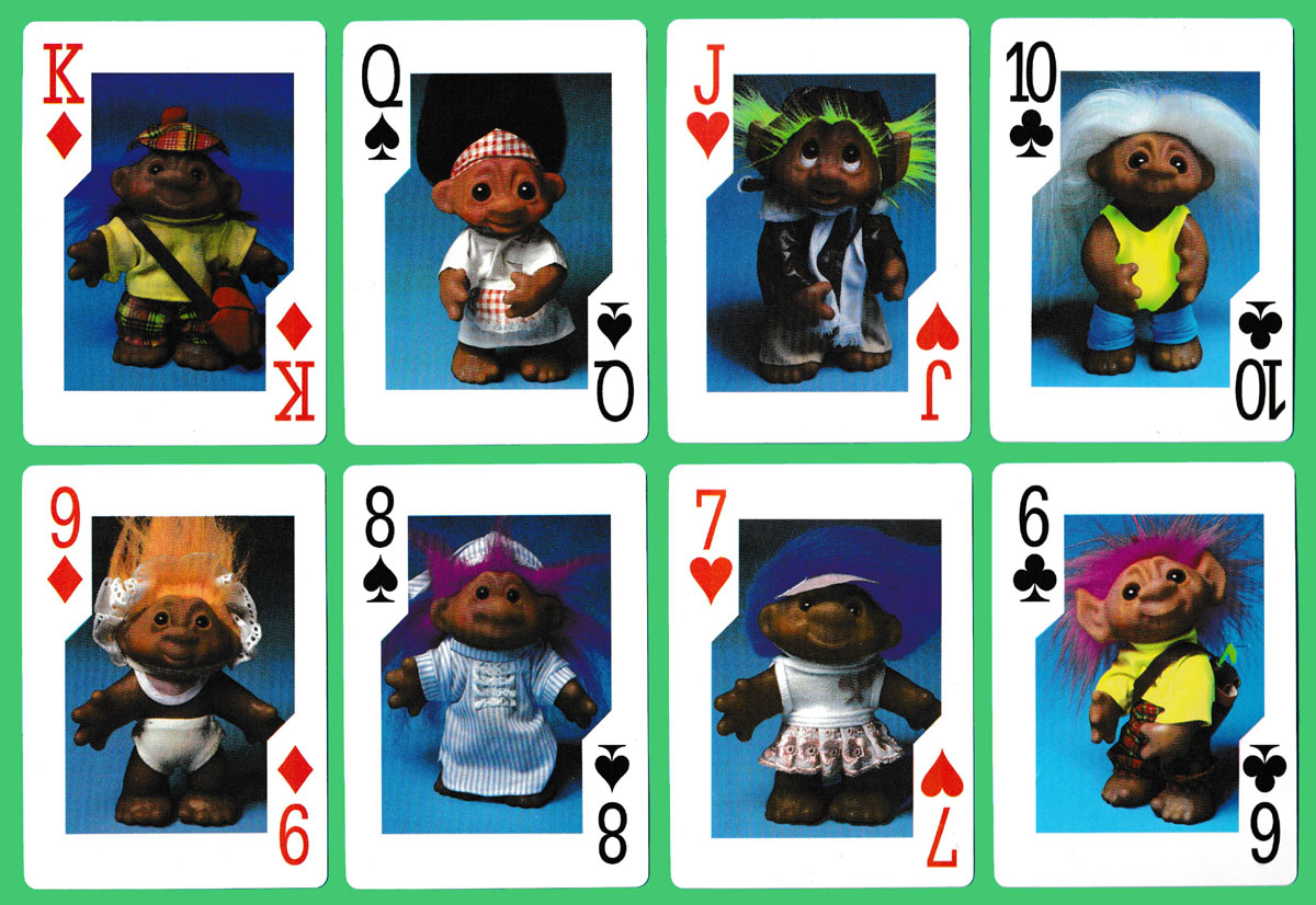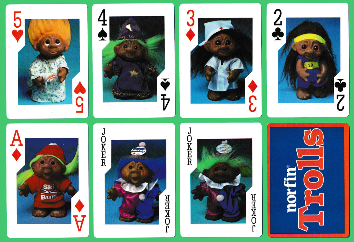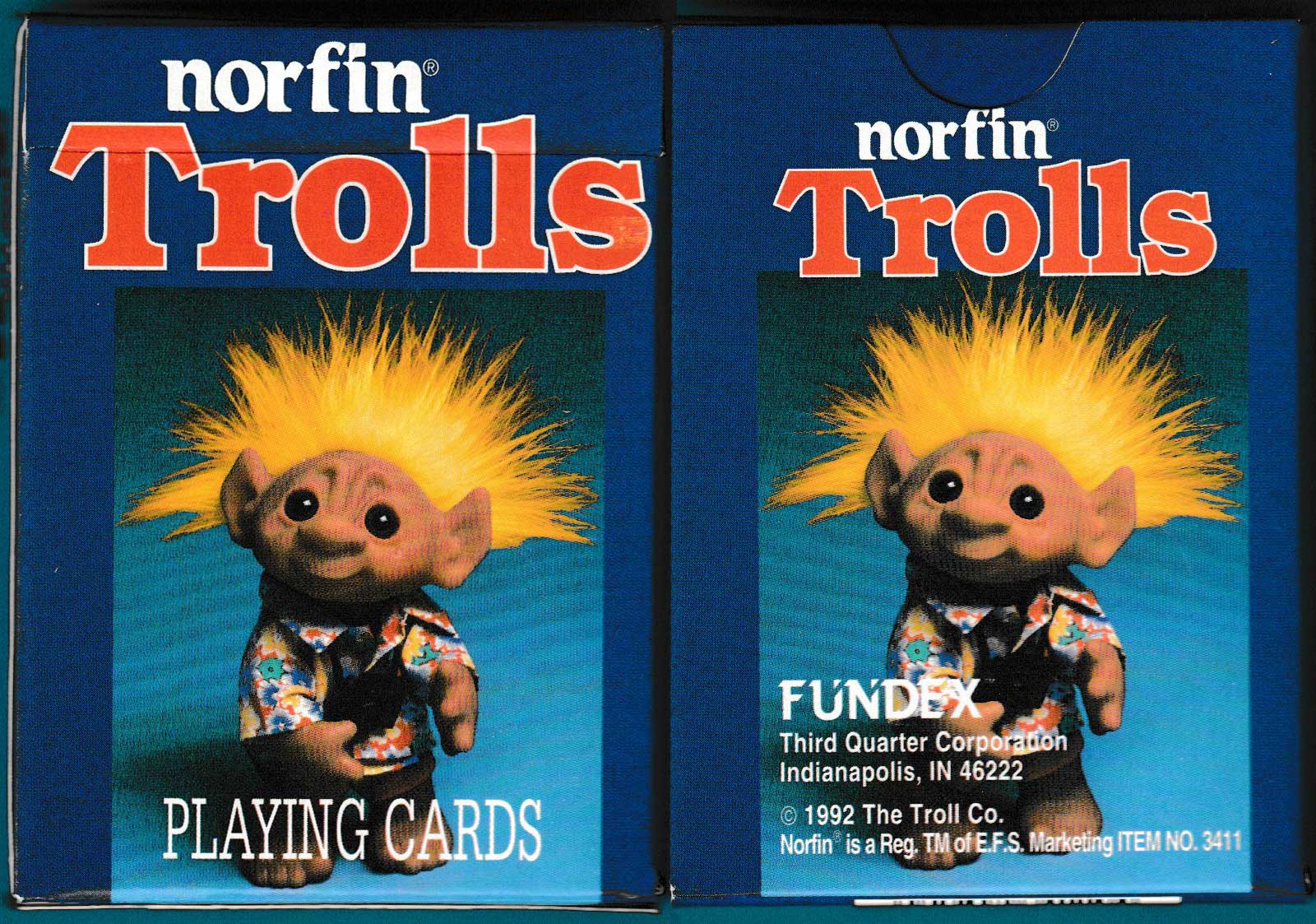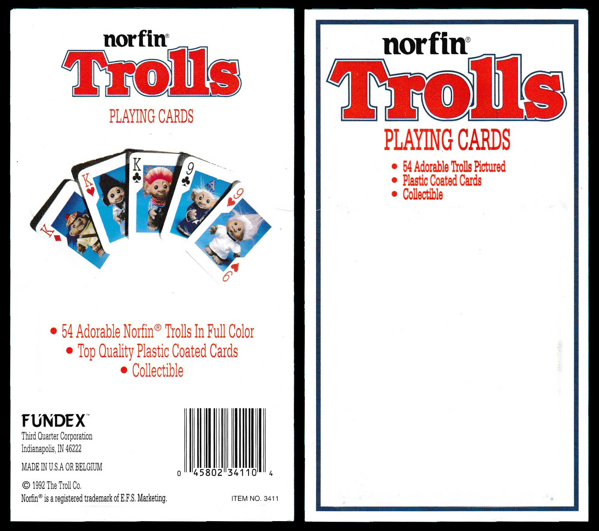 Above: Norfin® Trolls playing cards published by Fundex, Indianapolis, IN, USA, 1992. Made in U.S.A or Belgium. 52 cards + 2 Jokers in tuck box. Size: 63.5 x 89 mm. © 1992 The Troll Co.