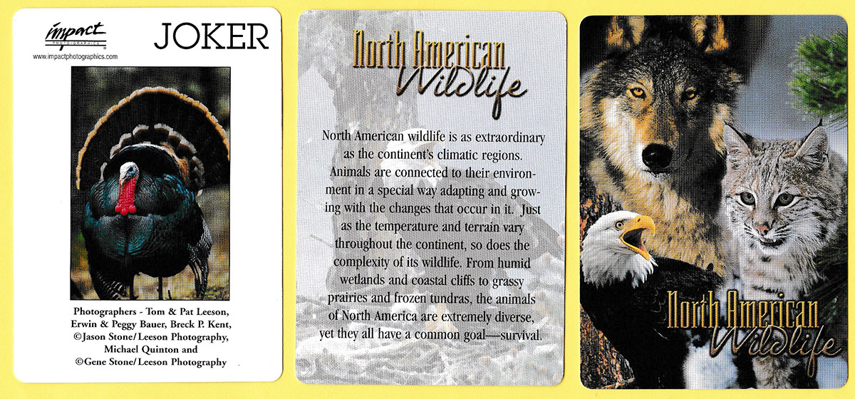 This pack, produced by Impact Photographics of El Dorado Hills, CA, displays 52 different photographs of wild animals native to North America. Informative text beneath each photo gives the name of the animal (common and scientific), together with information of its size, diet, hunting habit, and a description of the environment in which it lives. The photographs are credited to Tom & Pat Leeson, Erwin & Peggy Bauer, and Breck Kent. There are two identical jokers showing an American wild turkey (repeated on the king of diamonds), and two extra cards explaining the extreme diversity of North American wildlife. The same photo appears both on the box and on the back of the cards.