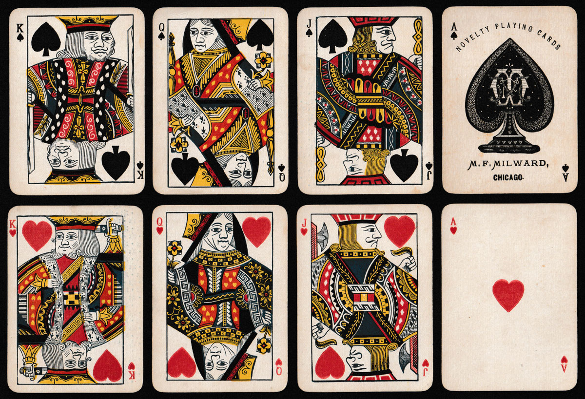 Above: Novelty Playing Cards made by M.F. Milward, Chicago, USA, c1890. 52 cards. Size: 64 x 88 mm.